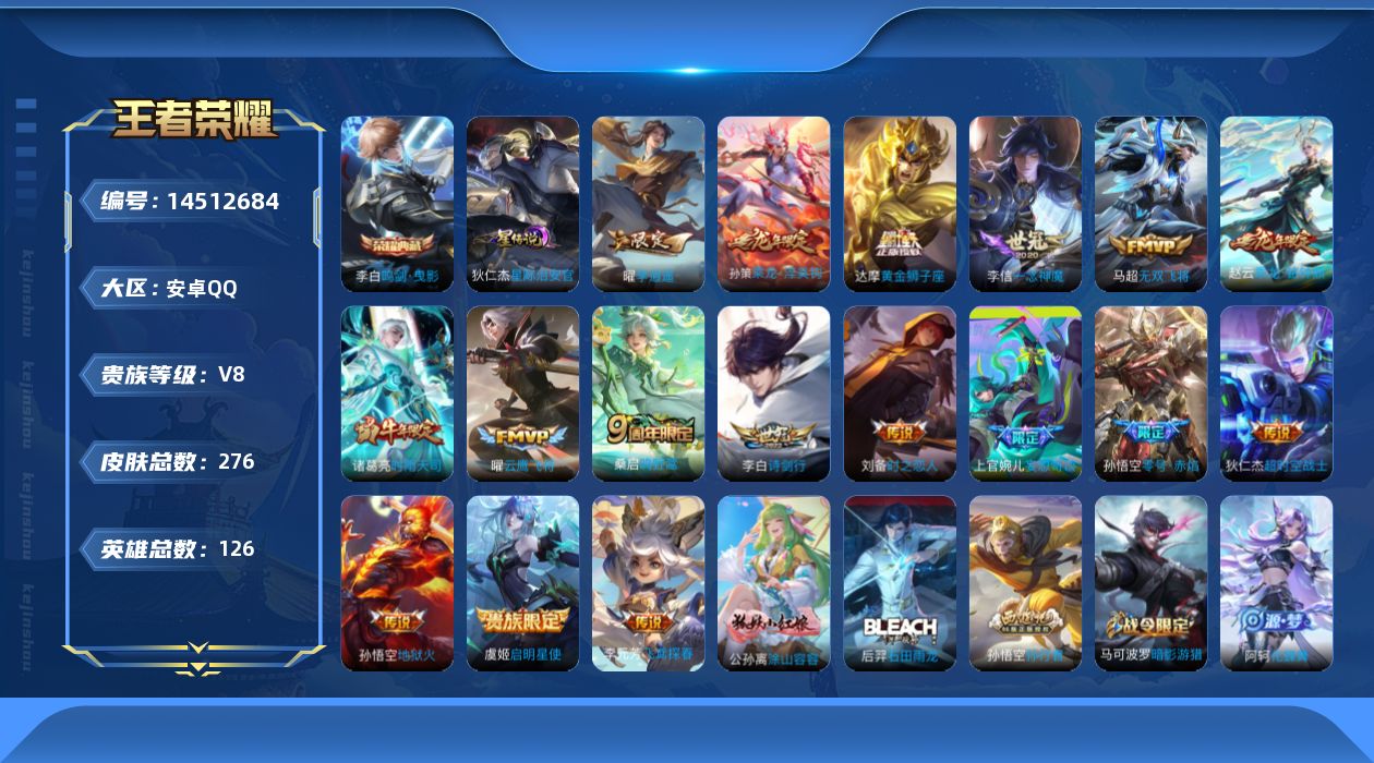 [14512684]【店主推荐捡漏号!可直接换绑/市50上官婉儿】:安卓Q-V8-最强王者段位-126英雄-276皮肤-1典藏皮肤-1星元-17传说-77史诗 【英雄全皮】:上官婉儿全皮,鲁班大师全皮 【荣耀典藏】:李白鸣剑曳影 【传说皮肤】:桑启鸣野蒿,孙策乘龙淬吴钩,赵云乘龙铭钟鼎,上官婉儿妄想奇谈,李白诗剑行,马超无双飞将,曜李逍遥 ,李元芳飞鸢探春,诸葛亮时雨天司,虞姬启明星使,孙悟空零号赤焰,曜云鹰飞将,李信一念神魔,刘备时之恋人,达摩黄金狮子座,孙悟空地狱火,狄仁杰超时空战士 【限定皮肤】:姜子牙天穹之誓,狄仁杰阴阳师,赵云皇家上将,墨子神迹守卫,庄周高山流水,高渐离死亡摇滚,孙膑天狼运算者,孙膑寅虎展翼,元歌云间偶戏,元歌无心,马可波罗暗影游猎,马可波罗山海玄木吟,狄仁杰魔术师,狄仁杰万华元夜,达摩星际陆战队,达摩沙漠行僧,项羽海滩派对,老夫子醍醐杖,老夫子航海奇遇记,程咬金演武夺筹,兰陵王金庭之子,亚瑟潮玩骑士王,孙悟空零号赤焰,孙悟空孙行者,后羿如梦令,李元芳银河之约,李元芳匿光侦查者,李元芳云中旅人,虞姬启明星使,钟馗驱傩正仪,杨玉环遇见飞天,干将莫邪胡桃夹子,雅典娜黎明之约,蔡文姬繁星吟游,鬼谷子原初探秘者,鬼谷子五谷丰年,诸葛亮时雨天司,苏烈千军破阵,弈星混沌棋,梦奇顽趣,沈梦溪星空之诺,沈梦溪大漠名商,明世隐疑决卦,裴擒虎天狼狩猎者,裴擒虎李小龙,裴擒虎擒涛扼浪,米莱狄胡桃异想国,云中君纤云弄巧,盾山御銮,猪八戒西部大镖客,上官婉儿梁祝,上官婉儿天狼绘梦者,上官婉儿神器万象笔,上官婉儿妄想奇谈,嫦娥暖冬兔眠,曜李逍遥 ,鲁班大师匿光启智者,鲁班大师探海日志,桑启海盐诗旅,暃星界游侠,艾琳女武神,阿古朵江河有灵,张良古海寻踪,蒙犽百解令,蒙恬荣光圣徽,鬼谷子天穹祈灯,伽罗琥珀纪元,姬小满妄想食味,孙策乘龙淬吴钩,赵云乘龙铭钟鼎,百里玄策超元猎域,沈梦溪龙舞盛年,鲁班七号蔬乡物语,李元芳蔬乡物语,刘邦剑破天穹,上官婉儿群星魔术团,程咬金群星魔术团,刘备异域游侠 【年限皮肤】:孙膑寅虎展翼,诸葛亮时雨天司,马可波罗山海玄木吟,孙策乘龙淬吴钩,赵云乘龙铭钟鼎 【赛季限定】:狄仁杰万华元夜,达摩沙漠行僧,老夫子醍醐杖,程咬金演武夺筹,兰陵王金庭之子,张良古海寻踪,李元芳云中旅人,钟馗驱傩正仪,雅典娜黎明之约,鬼谷子原初探秘者,苏烈千军破阵,弈星混沌棋,梦奇顽趣,沈梦溪