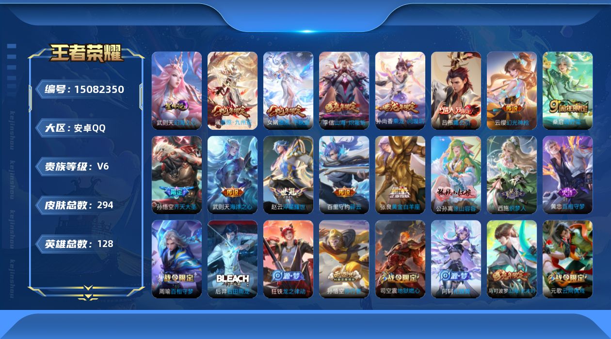 [15082350]可二次【店主推荐捡漏号!可直接换绑】:安卓Q-V7-最强王者段位-128英雄-294皮肤-1典藏英雄-1星元-13传说-82史诗 【英雄全皮】:孙权全皮,戈娅全皮,空空儿全皮 【荣耀典藏】:武则天英雄 【传说皮肤】:后羿神树通天,女娲愿照千秋盛,澜愿照九州拓,云缨幻光神枪,桑启鸣野蒿,吕布曦玄引,孙尚香乘龙问璇玑,孙悟空齐天大圣,李信山海炽霜斩,百里守约碎云,赵云淬星耀世,张良黄金白羊座,武则天海洋之心 【限定皮肤】:蔡文姬夏日便利店,虞姬夏日便利店,姜子牙天穹之誓,狄仁杰阴阳师,赵云皇家上将,妲己时之奇旅,孙尚香蔷薇恋人,钟无艳超时空战士,扁鹊奇幻香踪,芈月幻夜卜梦,吕布猎兽之王,元歌云间偶戏,元歌无心,甄姬落雪兰心,马可波罗山海玄木吟,狄仁杰魔术师,达摩沙漠行僧,项羽海滩派对,关羽百相守梦,程咬金演武夺筹,韩信飞衡,王昭君午后时光,兰陵王金庭之子,孙悟空孙行者,孙悟空齐天大圣,后羿圣弓游侠,李元芳云中旅人,钟馗驱傩正仪,杨玉环遇见飞天,杨戬潮玩骑兵,鬼谷子五谷丰年,黄忠火炮绅士,沈梦溪大漠名商,裴擒虎李小龙,裴擒虎擒涛扼浪,狂铁电玩高手,云中君纤云弄巧,李信山海炽霜斩,嫦娥拒霜思,嫦娥暖冬兔眠,西施玲珑珍味,鲁班大师探海日志,桑启海盐诗旅,暃星界游侠,戈娅驭风魔法,艾琳流音漫舞,司空震地狱燃心,阿古朵江河有灵,张良古海寻踪,高渐离燃音魔法,妲己灵卜魔法,鬼谷子天穹祈灯,伽罗琥珀纪元,姬小满妄想食味,孙尚香乘龙问璇玑,吕布曦玄引,沈梦溪龙舞盛年,刘邦剑破天穹,项羽苍威无极 【年限皮肤】:韩信飞衡,马可波罗山海玄木吟,李信山海炽霜斩,孙尚香乘龙问璇玑 【赛季限定】:达摩沙漠行僧,程咬金演武夺筹,兰陵王金庭之子,张良古海寻踪,李元芳云中旅人,钟馗驱傩正仪,沈梦溪大漠名商,裴擒虎擒涛扼浪,鲁班大师探海日志,桑启海盐诗旅,鬼谷子天穹祈灯,刘邦剑破天穹,姜子牙天穹之誓 【战令限定】:蔡文姬夏日便利店,虞姬夏日便利店,钟无艳超时空战士,扁鹊奇幻香踪,芈月幻夜卜梦,吕布猎兽之王,元歌云间偶戏,甄姬落雪兰心,王昭君午后时光,艾琳流音漫舞,后羿圣弓游侠,杨戬潮玩骑兵,黄忠火炮绅士,狂铁电玩高手,嫦娥暖冬兔眠,西施玲珑珍味,司空震地狱燃心,暃星界游侠,戈娅驭风魔法,高渐离燃音魔法,妲己灵卜魔法,项羽苍威无极 【史诗皮肤】:露娜紫霞仙子,阿轲暗夜猫娘,赵云皇家上将,赵云未来纪元,貂蝉