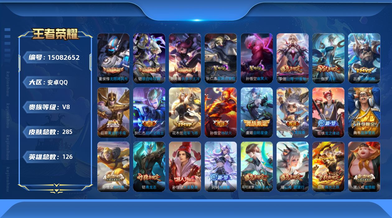 [15082652]可二次【店主推荐捡漏号!可直接换绑】,安卓Q-V8-永恒钻石II段位-126英雄-285皮肤-3典藏皮肤-10传说-62史诗 【英雄全皮】:影全皮 【荣耀典藏】:夏侯惇无限飓风号,孙尚香杀手不太冷,铠银白咏叹调 【传说皮肤】:后羿神树通天,李信山海炽霜斩,吕布怒海麟威,李元芳飞鸢探春,虞姬启明星使,伽罗太华,花木兰冠军飞将,后羿黄金射手座,孙悟空地狱火,狄仁杰超时空战士 【限定皮肤】:白起狰,狄仁杰阴阳师,虞姬凯尔特女王,赵云皇家上将,墨子神迹守卫,妲己时之彼端,嬴政白昼王子,鲁班七号狮舞东方,庄周高山流水,阿轲迷踪丽影,孙膑妖精王,孙膑寅虎展翼,扁鹊炼金王,芈月幻夜卜梦,吕布猎兽之王,元歌无心,夏侯惇朔风刀,甄姬游园惊梦,曹操烛龙,曹操天狼征服者,典韦穷奇,典韦蓝屏警告,马可波罗山海玄木吟,狄仁杰魔术师,狄仁杰万华元夜,达摩沙漠行僧,项羽海滩派对,老夫子醍醐杖,老夫子航海奇遇记,刘邦夺宝奇兵,兰陵王金庭之子,孙悟空大圣娶亲,孙悟空孙行者,牛魔御旌,后羿辉光之辰,后羿圣弓游侠,李元芳云中旅人,虞姬启明星使,钟馗神迹守卫,钟馗驱傩正仪,杨玉环遇见飞天,女娲朔望之晖,干将莫邪真爱魔法,雅典娜黎明之约,太乙真人饕餮,鬼谷子原初探秘者,黄忠火炮绅士,铠青龙志,苏烈千军破阵,百里玄策原初追逐者,弈星混沌棋,沈梦溪大漠名商,明世隐疑决卦,裴擒虎擒涛扼浪,狂铁御狮,米莱狄御霄,瑶山海碧波行,李信山海炽霜斩,伽罗太华,盾山御銮,猪八戒猪悟能,嫦娥暖冬兔眠,鲁班大师探海日志,桑启海盐诗旅,暃星界游侠,艾琳女武神,鬼谷子天穹祈灯,沈梦溪龙舞盛年 【年限皮肤】:铠青龙志,孙膑寅虎展翼,后羿辉光之辰,伽罗太华,瑶山海碧波行,马可波罗山海玄木吟,李信山海炽霜斩 【赛季限定】:孙膑妖精王,扁鹊炼金王,白起狰,夏侯惇朔风刀,曹操烛龙,典韦穷奇,狄仁杰万华元夜,达摩沙漠行僧,老夫子醍醐杖,兰陵王金庭之子,牛魔御旌,李元芳云中旅人,虞姬凯尔特女王,钟馗驱傩正仪,雅典娜黎明之约,太乙真人饕餮,鬼谷子原初探秘者,苏烈千军破阵,百里玄策原初追逐者,弈星混沌棋,沈梦溪大漠名商,明世隐疑决卦,裴擒虎擒涛扼浪,狂铁御狮,米莱狄御霄,盾山御銮,鲁班大师探海日志,桑启海盐诗旅,鬼谷子天穹祈灯 【战令限定】:墨子神迹守卫,嬴政白昼王子,鲁班七号狮舞东方,阿轲迷踪丽影,芈月幻夜卜梦,吕布猎兽之王,典韦蓝屏警告,老夫子