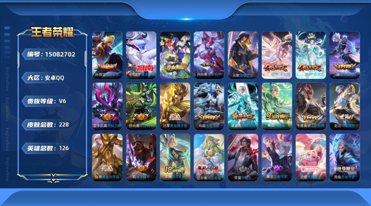 [15082702]【店主推荐捡漏号!可直接换绑】发育路32段,安卓Q-V6-最强王者段位-126英雄-228皮肤-1典藏皮肤-2珍品传说-1星传说-15传说-56史诗 【英雄全皮】:元歌全皮,孙权全皮,影全皮 【荣耀典藏】:孙悟空全息碎影 【珍品传说】:马可波罗怪盗基德,孙策时之奇旅 【传说皮肤】:后羿神树通天,元歌诡秘之主,妲己愿照众生和,虞姬愿照岁时盈,桑启鸣野蒿,澜逐花归海,马超无双飞将,赵云淬星耀世,诸葛亮时雨天司,铠绛天战甲,张良黄金白羊座,干将莫邪久胜战神,达摩黄金狮子座,孙尚香末日机甲,宫本武藏地狱之眼 【限定皮肤】:杨戬破阵退雄兵,狄仁杰阴阳师,赵云皇家上将,孙尚香蔷薇恋人,庄周高山流水,高渐离玩趣恶龙,元歌云间偶戏,元歌无心,甄姬游园惊梦,狄仁杰魔术师,狄仁杰万华元夜,达摩沙漠行僧,项羽海滩派对,程咬金演武夺筹,兰陵王金庭之子,花木兰默契交锋,亚瑟潮玩骑士王,孙悟空至尊宝,后羿辉光之辰,李元芳匿光侦查者,李元芳云中旅人,钟馗驱傩正仪,雅典娜黎明之约,太乙真人华丽摇滚,鬼谷子原初探秘者,鬼谷子五谷丰年,诸葛亮时雨天司,苏烈千军破阵,百里玄策原初追逐者,梦奇顽趣,沈梦溪大漠名商,裴擒虎李小龙,裴擒虎擒涛扼浪,上官婉儿梁祝,鲁班大师探海日志,桑启海盐诗旅,阿古朵江河有灵,张良古海寻踪,蒙恬荣光圣徽,鬼谷子天穹祈灯,沈梦溪龙舞盛年,刘邦剑破天穹,程咬金群星魔术团,镜青焰无极,项羽苍威无极 【年限皮肤】:后羿辉光之辰,诸葛亮时雨天司,马超神威 【赛季限定】:狄仁杰万华元夜,达摩沙漠行僧,程咬金演武夺筹,兰陵王金庭之子,张良古海寻踪,李元芳云中旅人,钟馗驱傩正仪,雅典娜黎明之约,鬼谷子原初探秘者,苏烈千军破阵,百里玄策原初追逐者,梦奇顽趣,沈梦溪大漠名商,裴擒虎擒涛扼浪,鲁班大师探海日志,桑启海盐诗旅,鬼谷子天穹祈灯,蒙恬荣光圣徽,刘邦剑破天穹 【战令限定】:元歌云间偶戏,亚瑟潮玩骑士王,镜青焰无极,项羽苍威无极 【史诗皮肤】:项羽苍穹之光,阿轲暗夜猫娘,赵云皇家上将,甄姬冰雪圆舞曲,王昭君偶像歌手,狄仁杰魔术师,宫本武藏鬼剑武藏,孙尚香蔷薇恋人,孙尚香水果甜心,妲己魅力维加斯,妲己女仆咖啡,墨子金属风暴,刘禅绅士熊喵,曹操幽灵船长,李白千年之狐,孙悟空至尊宝,花木兰水晶猎龙者,兰陵王暗隐猎兽者,甄姬游园惊梦,后羿辉光之辰,铠曙光守护者,刘禅天才门将,白起星夜王子,阿轲节奏热