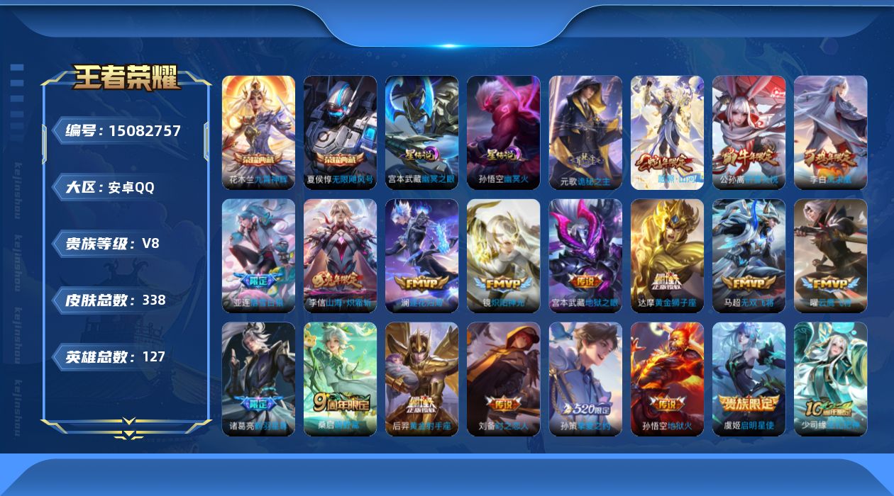 - [13869569]安卓Q-V9-457皮肤-2典藏-1无双-36传说-142史诗 【英雄全皮】:达摩全皮,刘邦全皮,孙权全皮,钟馗全皮,鬼谷子全皮,沈梦溪全皮,狂铁全皮,猪八戒全皮,马超全皮,鲁班大师全皮,夏洛特全皮,金蝉全皮,空空儿全皮,影全皮 【荣耀典藏】:武则天英雄,关羽赤影疾锋,貂蝉幻阙歌 【无双皮肤】:武则天神器明辉仪 【传说皮肤】:后羿神树通天,大司命死亡执政官,妲己愿照众生和,澜愿照九州拓,虞姬愿照岁时盈,云缨幻光神枪,桑启鸣野蒿,孙尚香乘龙问璇玑,孙策乘龙淬吴钩,赵云乘龙铭钟鼎,马超琥珀纪元,铠琥珀纪元,宫本武藏惊梅引,亚瑟追逃游戏,安琪拉追逃游戏,夏洛特浮生妄,干将莫邪画中仙,花木兰燃星之曲,孙悟空齐天大圣,小乔山海琳琅生,曜山海苍雷引,李信山海炽霜斩,百里守约碎云,马超无双飞将,赵云淬星耀世,虞姬启明星使,曜云鹰飞将,貂蝉猫影幻舞,干将莫邪久胜战神,达摩黄金狮子座,貂蝉仲夏夜之梦,李白凤求凰,孙尚香末日机甲,宫本武藏地狱之眼,孙悟空地狱火,狄仁杰超时空战士 【限定皮肤】:白起狰,大乔绒语心约,姜子牙天穹之誓,狄仁杰阴阳师,小乔山海琳琅生,赵云皇家上将,墨子神迹守卫,墨子降魔,妲己时之彼端,嬴政优雅恋人,嬴政白昼王子,鲁班七号狮舞东方,庄周高山流水,高渐离玩趣恶龙,阿轲迷踪丽影,钟无艳超时空战士,孙膑天狼运算者,扁鹊奇幻香踪,白起夜都怪侠,芈月重明,芈月幻夜卜梦,吕布猎兽之王,吕布御风骁将,周瑜赤莲之焰,元歌云间偶戏,元歌无心,夏侯惇朔风刀,甄姬落雪兰心,曹操烛龙,典韦穷奇,典韦蓝屏警告,典韦岱宗,马可波罗暗影游猎,马可波罗山海玄木吟,狄仁杰魔术师,狄仁杰万华元夜,达摩星际陆战队,达摩沙漠行僧,项羽海滩派对,老夫子醍醐杖,老夫子航海奇遇记,关羽冰锋战神,安琪拉追逃游戏,程咬金演武夺筹,刘邦夺宝奇兵,韩信飞衡,王昭君午后时光,兰陵王驯魔猎人,兰陵王金庭之子,花木兰青春决赛季,花木兰瑞麟志,花木兰燃星之曲,亚瑟潮玩骑士王,亚瑟追逃游戏,孙悟空至尊宝,孙悟空大圣娶亲,孙悟空孙行者,孙悟空齐天大圣,牛魔御旌,后羿辉光之辰,后羿圣弓游侠,李元芳银河之约,李元芳云中旅人,虞姬启明星使,钟馗神迹守卫,钟馗驱傩正仪,杨玉环遇见飞天,杨戬潮玩骑兵,女娲朔望之晖,干将莫邪真爱魔法,干将莫邪画中仙,雅典娜单词大作战,蔡文姬繁星吟游,太乙真人饕餮,东皇太一逐梦之光,鬼谷子原初探秘者,鬼谷