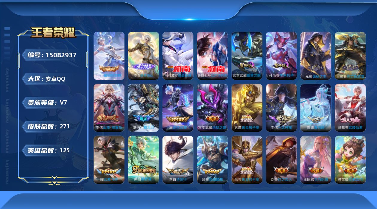 [15082937]【店主推荐捡漏号!可直接换绑/打野36段/1省标/1市标】:安卓Q-V7-最强王者段位-125英雄-271皮肤-1典藏皮肤-1无双-1星元-2珍品传说-20传说-74史诗