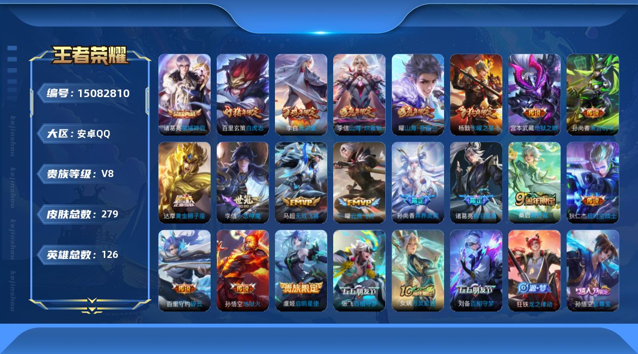 [15082810]可二次【店主推荐捡漏号!可直接换绑】:安卓Q-V8-最强王者段位-126英雄-279皮肤-1典藏皮肤-19传说-68史诗