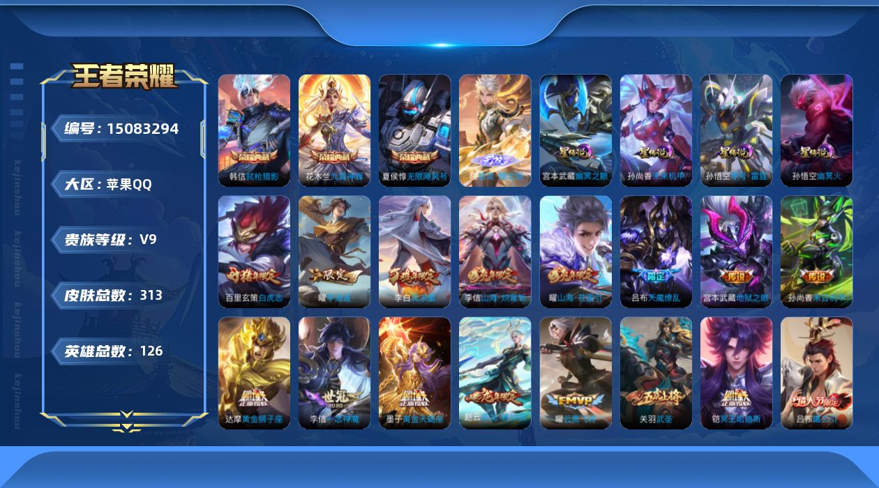 [15083294]可二次【店主推荐捡漏号!可直接换绑】,苹果Q-V9-最强王者段位-126英雄-313皮肤-3典藏皮肤-1无双-30传说-113史诗 【英雄全皮】:李信全皮,曜全皮 【荣耀典藏】:夏侯惇无限飓风号,花木兰九霄神辉,韩信弑枪猎影 【无双皮肤】:曜器灵螭龙剑 【传说皮肤】:后羿神树通天,桑启鸣野蒿,铠冥王哈迪斯,墨子黄金天蝎座,吕布曦玄引,赵云乘龙铭钟鼎,宫本武藏惊梅引,曜山海苍雷引,李信山海炽霜斩,李白诗剑行,王昭君星穹之声,貂蝉遇见胡旋,赵云淬星耀世,曜李逍遥 ,铠绛天战甲,虞姬启明星使,孙悟空零号赤焰,关羽武圣,曜云鹰飞将,李信一念神魔,刘备时之恋人,达摩黄金狮子座,百里玄策白虎志,花木兰冠军飞将,后羿黄金射手座,李白凤求凰,孙尚香末日机甲,宫本武藏地狱之眼,孙悟空地狱火,吕布天魔缭乱 【限定皮肤】:铠冥王哈迪斯,狄仁杰阴阳师,赵云皇家上将,赵云引擎之心,赵云龙胆,墨子神迹守卫,妲己时之彼端,嬴政优雅恋人,嬴政白昼王子,孙尚香蔷薇恋人,鲁班七号狮舞东方,庄周高山流水,高渐离玩趣恶龙,阿轲迷踪丽影,钟无艳超时空战士,芈月白晶晶,芈月幻夜卜梦,吕布天魔缭乱,吕布猎兽之王,吕布御风骁将,周瑜赤莲之焰,元歌云间偶戏,元歌无心,夏侯惇朔风刀,甄姬游园惊梦,甄姬落雪兰心,曹操天狼征服者,典韦蓝屏警告,马可波罗逐梦之星,马可波罗暗影游猎,狄仁杰魔术师,狄仁杰万华元夜,达摩星际陆战队,达摩沙漠行僧,项羽海滩派对,项羽霸王别姬,老夫子醍醐杖,老夫子航海奇遇记,关羽冰锋战神,关羽武圣,貂蝉遇见胡旋,程咬金演武夺筹,刘邦夺宝奇兵,韩信逐梦之影,韩信飞衡,韩信傲雪梅枪,王昭君午后时光,王昭君星穹之声,兰陵王金庭之子,花木兰青春决赛季,花木兰瑞麟志,花木兰默契交锋,亚瑟潮玩骑士王,孙悟空至尊宝,孙悟空大圣娶亲,孙悟空零号赤焰,孙悟空孙行者,牛魔御旌,牛魔奔雷神使,后羿辉光之辰,李元芳银河之约,李元芳匿光侦查者,李元芳云中旅人,虞姬启明星使,钟馗神迹守卫,钟馗驱傩正仪,女娲朔望之晖,干将莫邪冰霜恋舞曲,雅典娜单词大作战,雅典娜黎明之约,蔡文姬繁星吟游,东皇太一逐梦之光,鬼谷子原初探秘者,鬼谷子五谷丰年,黄忠烈魂,黄忠火炮绅士,铠青龙志,苏烈千军破阵,百里玄策白虎志,百里玄策原初追逐者,百里守约朱雀志,弈星混沌棋,梦奇顽趣,沈梦溪星空之诺,沈梦溪大漠名商,明世隐疑决卦,裴擒虎天狼狩猎者,裴擒虎