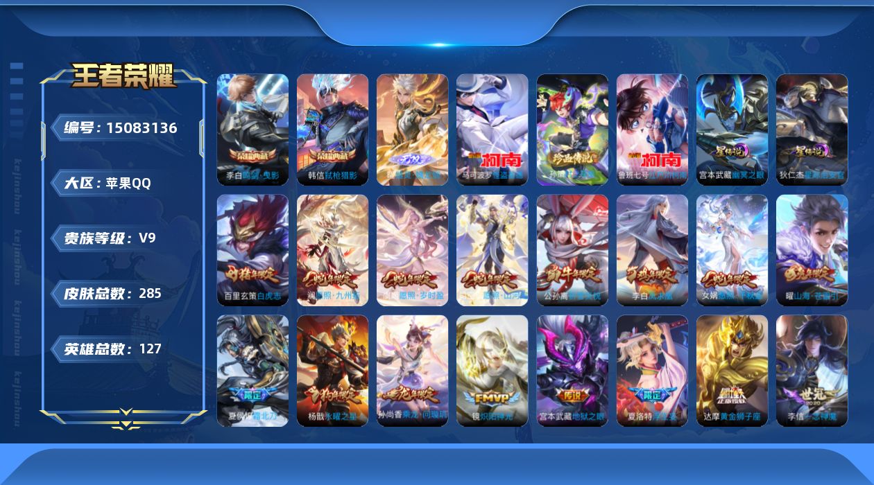 [15083136]可二次【店主推荐捡漏号!可直接换绑/30段发育路/1市标】:苹果Q-V9-最强王者段位-127英雄-285皮肤-2典藏皮肤-1无双-2星元-3珍品传说-31传说-92史诗