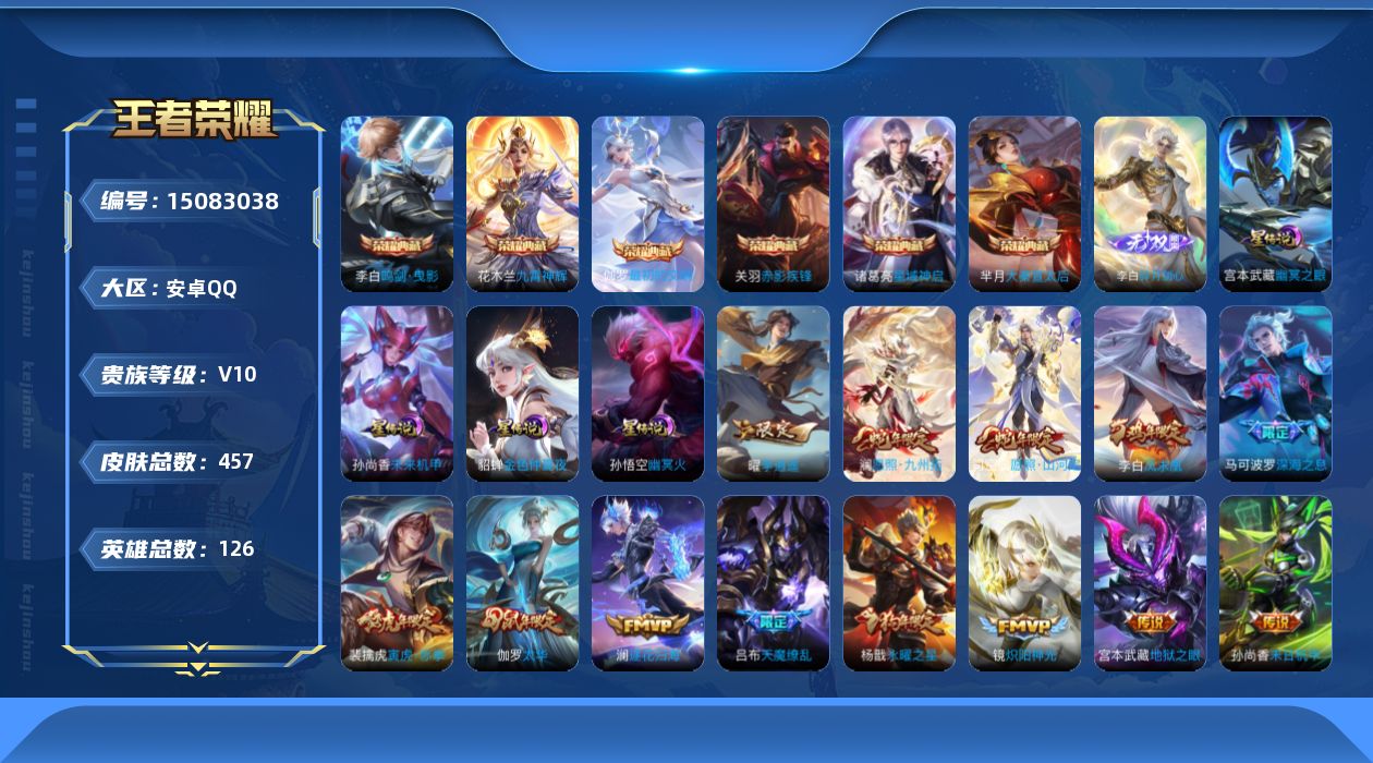- [11882287]V8 1典藏 12传说 125英雄 349皮肤 可修改实名 优质装备:鸣剑·曳影,黄金狮子座,黄金射手座,冠军飞将,云鹰飞将(小将军),地狱火,零号·赤焰,李逍遥,澜逐花归海 珍宝阁皮:万物之道,优雅恋人,玩趣恶龙 限定皮:鸣野蒿,白虎志(电光耗子),傲雪梅枪,瑞麟志(木兰年限),高山流水,五谷丰年,青龙志(铠年限),冰锋战神,武圣,梁祝,李小龙,逐梦之影,玄武志(苏烈年限),朱雀志(守约年限),霸王别姬-项羽,默契交锋-花木兰,猪悟能,一生所爱,大圣娶亲,青春决赛季,冰霜恋舞曲,蜜橘之夏,寅虎·心曲(虎婆) 史诗皮:星界战将,龙之律动,蔬乡物语(鲁班七号),超元猎域,百相守梦-黄忠,紫霞仙子,苍穹之光,白龙吟,黄金分割率,特工魅影,电玩·爆裂旋风,百解令(蒙犽),蒙恬荣光圣徽,偶像歌手,暗夜猫娘,末日机甲-吕布,猫狗日记-孙策,乱世虎臣,节奏热浪,修罗,女仆咖啡,摇滚巨星,水果甜心,绅士熊喵,天才门将,星夜王子,心灵骇客,功夫厨神,德古拉伯爵,暗隐猎兽者,幽灵船长,鬼剑武藏,暗渊魔法,心灵战警,天秀·启明,地狱岩魂,纤云弄巧,繁星吟游(呼啦呼啦),拒霜思,缤纷独角兽,乘风破浪,逐浪之夏,水晶猎龙者,曙光守护者,热力回旋,金属风暴,原初追逐者,圣诞狂欢,圣诞恋歌,鹰眼统帅,暗夜贵公子,魅力维加斯,黎明之约,无心,未来纪元-赵云