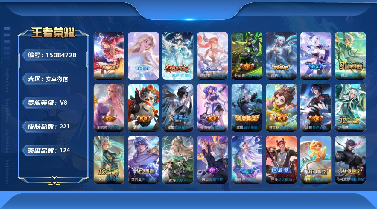 [15084728]安卓WX-V8-最强王者段位-124英雄-221皮肤-1典藏皮肤-1无双-13传说-68史诗-女号!瑶典藏!甄姬无双!