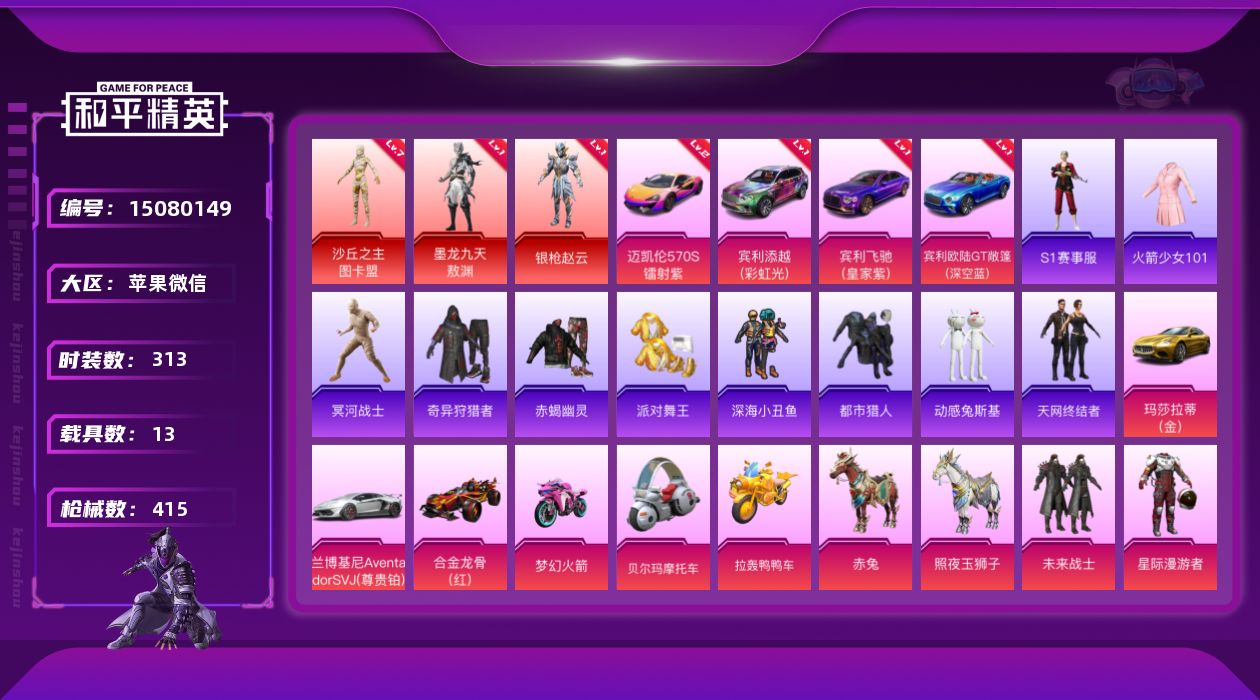 [15080149]极品明星ID:林更新 满级图卡盟=老101+s1全套苹果 微信-3红装-40粉装-25特效枪-12载具-209370热力值-28印记-313套装-415枪皮 【角色神装】:墨龙九天-敖渊,沙丘之主-图卡盟,角色-银枪赵云 【角色神装等级】:墨龙九天-敖渊(一级),沙丘之主-图卡盟(七级),角色-银枪赵云(一级) 【稀有载具】:兰博基尼Aventador SVJ(尊享铂),玛莎拉蒂Ghibli(金),宾利欧陆GT敞篷(深空蓝),宾利飞驰(皇家紫),宾利添越(彩虹光),迈凯伦570S(镭射紫),合金龙骨(红),双人摩托-梦幻火箭,布尔玛摩托车,拉轰鸭鸭车,空客H135-恋语之翼,赤兔,照夜玉狮子 【稀有载具等级】:迈凯伦570S(镭射紫)(二级),宾利添越(彩虹光)(一级),宾利飞驰(皇家紫)(一级),宾利欧陆GT敞篷(深空蓝)(一级) 【特效枪等级】:AKM-炫紫旋律(一级),AKM-星际浪客(一级),AKM-盖世英雄(九级),SCAR-L-桃夭倾城(一级),SCAR-L-天蓬元帅(九级),SCAR-L-纯梦嫁纱(五级),M416-五爪金龙(七级),M416-心之恋语(一级),M416-墨龙九天(三级),GROZA-旋转彩虹(五级),AUG-星之彼岸(六级),M762-甜蜜誓约(一级),M762-甜心娃娃(七级),UMP45-雪国精灵(七级),AKS-74U-星穹咏叹调(四级),P90-甜蜜草莓(五级),P90-沙丘之主(三级),Kar98K-巳巳如意(三级),M24-星之信仰(五级),AWM-橘柚倾心(四级),SPAS-12-音爆索尼克(七级),DP-28-圣堂之誓(一级),MG3-洛神天依(一级),MG3-酷泡奶龙(七级),破片手榴弹-瓶中星球(七级) 【优质套装】:粉装-未来战士,粉装-星际漫游者,粉装-怪诞乔克,粉装-甜心巧克力,粉装-宝贝奶油派,粉装-天使彩虹糖,粉装-雪国幻梦,粉装-蝶舞迷情,粉装-梦幻火箭,粉装-金风玉露,粉装-缤纷油彩,粉装-放客神游,粉装-天禅智恒,粉装-向日葵,粉装-绚金战神,粉装-星之彼岸,角色-洛天依,角色-2号机款机体服,粉装-蓝莓炮弹,粉装-精灵娃娃,粉装-甜蜜草莓,粉装-旋转彩虹,粉装-冰川粉黛,粉装-冰川幽秘,粉装-冰川红玫,粉装-桃夭倾城,粉装-碧穹智者,粉装-光明术士,粉装-启明星,粉装-暗夜鎏金,粉装-音爆索尼克