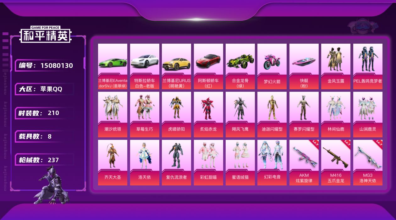 - [14010938]【店主推荐捡漏号!可直接换绑】 苹果 手Q-8粉装-6特效枪-7载具-2粉色飞行器-6.3w热力值-6王牌印记-124套装-152枪皮【热门品类】:粉装-梦幻火箭,套装-浪漫天命,套装-龟仙人,套装-潮萌小黄鸭,套装-暗影哥特,套装-浪漫波比,套装-粉红小猪,套装-萌熊伴侣【粉色载具】:特斯拉Roadster(水滴蓝),特斯拉Roadster(沁心粉),特斯拉Cybertruck(荒芜蓝),玛莎拉蒂Ghibli(粉),双人摩托-梦幻火箭,空客H135-蔚蓝之翼,快艇-塞莎KL27(霓虹粉)【粉色套装】:粉装-梦幻火箭,粉装-苍蓝魅影,粉装-翡翠骑士,粉装-绚金战神,粉装-香水柠檬,粉装-暗翼战神,角色-零号机款机体服,粉装-炫光之旅【粉色枪皮等级】:AKM-炫紫旋律(四级),M416-五爪金龙(四级),GROZA-香水柠檬(七级),M762-激战未来(七级),M249-彩虹甜喵(四级),DP-28-豹影疾电(五级)【粉色飞行器】:梦幻火箭飞行器