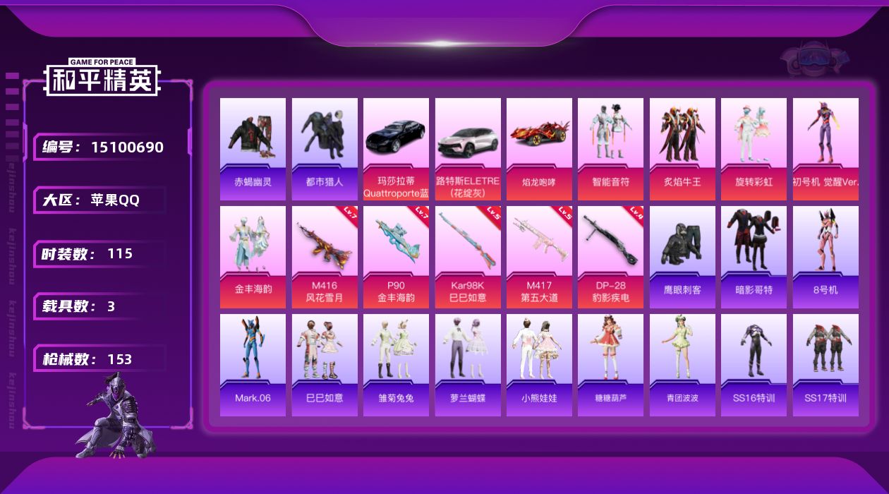 [15100690]素材身法号/无敌战神框3/绝世印记1/地铁满天赋【特价急出/详情看图】:苹果 手Q-无敌战神框-5粉装-5特效枪-3载具-1粉色飞行器-5.2w热力值-13王牌印记-115套装-153枪皮【热门品类】:套装-赤蝎幽灵,套装-都市猎人,套装-暗影哥特,角色-8号机,角色-Mark.06【粉色载具】:路特斯ELETRE(花绽灰),玛莎拉蒂Quattroporte(夜幕蓝),焰龙咆哮【粉色套装】:粉装-智能音符,粉装-炙焰牛王,粉装-旋转彩虹,角色-初号机 觉醒Ver.,粉装-金丰海韵【粉色枪皮等级】:M416-风花雪月(七级),P90-金丰海韵(七级),Kar98K-巳巳如意(五级),M417-第五大道(五级),DP-28-豹影疾电(四级)【粉色飞行器】:初号机 觉醒Ver.飞行器
