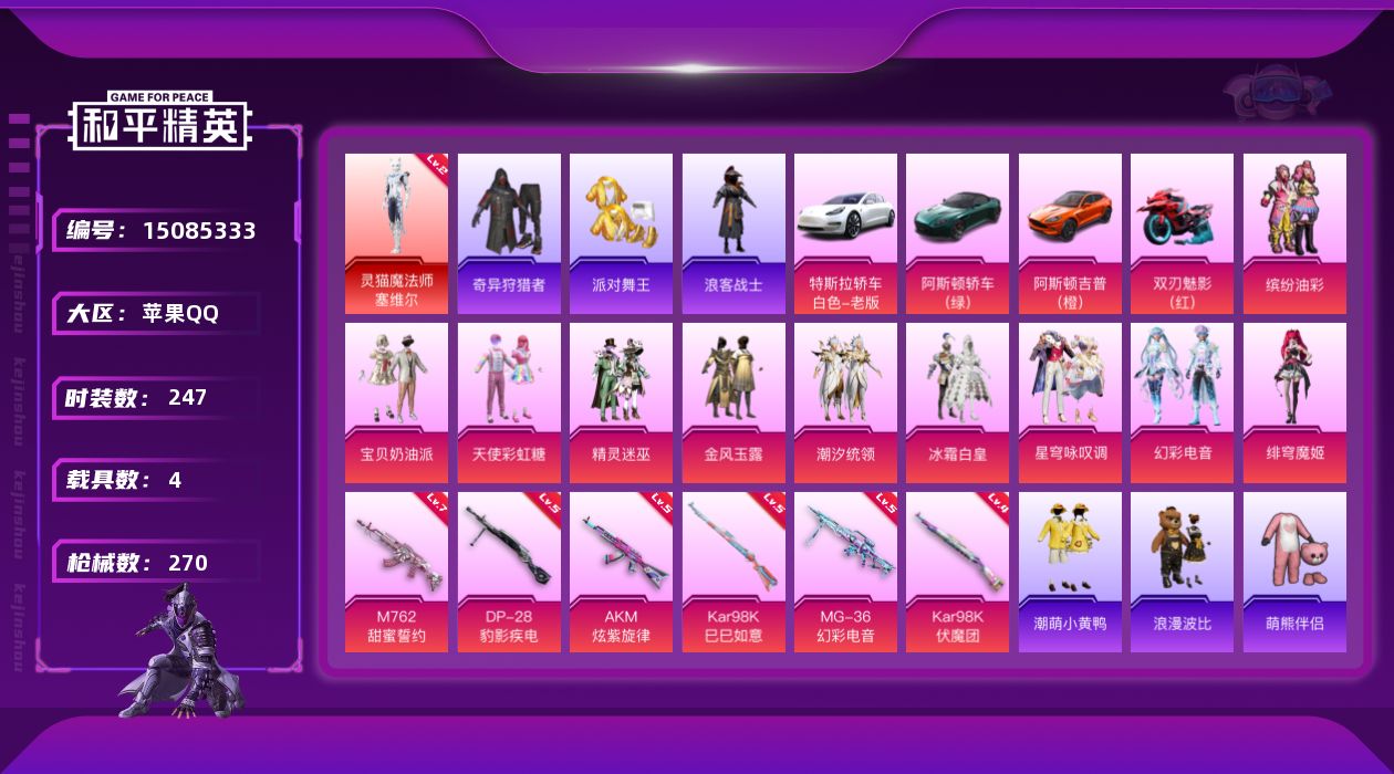 - PX_2070676- 可二次 苹果手Q-11王牌印记-4粉装-6特效枪-0载具-64119热力值-186套装-218枪皮-0卓越印记-0传奇印记, 【4粉装】,宝贝奶油派,新星烈龙,麻辣鲜香锅,数码大师, 【6特效枪】,AKM-绿萝繁花-5级,SCAR-L-锦绣绵绵-5级,M416-五爪金龙-6级,GROZA-镜光银凌-5级,M762-青锋波束-5级,Kar98K-巳巳如意-5级, 【4稀有紫装