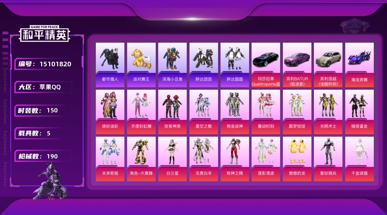 [15101820]素材身法号【特价急出/详情看图】:苹果 手Q-19粉装-7特效枪-5载具-3粉色飞行器-7w热力值-7王牌印记-150套装-190枪皮【热门品类】:粉装-缤纷油彩,套装-浪漫天命,套装-都市猎人,套装-派对舞王,套装-深海小丑鱼,套装-胖达团团,套装-胖达圆圆,套装-六号树人,套装-潮萌小黄鸭,套装-暗影哥特,大砍刀-青龙偃月刀【粉色载具】:玛莎拉蒂Quattroporte(夜幕蓝),宾利BATUR(极速紫),宾利添越(浅瞪羚棕),海龙奔腾,僚机-萌兔起飞【粉色套装】:粉装-天使彩虹糖,粉装-缤纷油彩,粉装-放客神游,粉装-星空之魅,粉装-绚金战神,粉装-馨动时刻,粉装-酣梦娃娃,粉装-光明术士,粉装-暗夜鎏金,粉装-未来歌姬,角色-大黄蜂,角色-白兰星,粉装-无畏白羊,粉装-牧神之羯,粉装-莲影清波,粉装-傲傲奶龙,角色-紫钛骑兵,角色-千金淑猫,角色-荧海星豚【粉色枪皮等级】:AKM-星际浪客(七级),M416-心之恋语(七级),AUG-暖羊咩咩(五级),Kar98K-巳巳如意(五级),AMR-炫光之旅(四级),SVD-月影灵韵(四级),DP-28-豹影疾电(五级)【粉色飞行器】:春暖花开飞行器,星际浪客飞行器,戏水时光飞行器