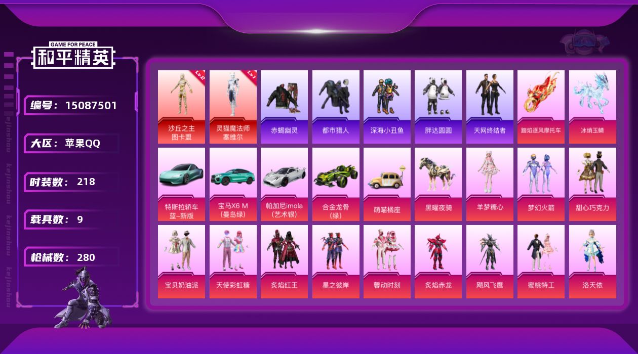 [15087501]素材身法号 苹果 手Q-2神装-17粉装-14特效枪-9载具-9粉色飞行器-10.5w热力值-13王牌印记-218套装-280枪皮【红色神装等级】:灵猫魔法师-塞维尔(一级),沙丘之主-图卡盟(二级)【热门品类】:粉装-梦幻火箭,套装-浪漫天命,套装-赤蝎幽灵,套装-都市猎人,套装-深海小丑鱼,套装-胖达圆圆,套装-天网终结者,套装-AG战队服,套装-潮萌小黄鸭,套装-暗影哥特,角色-Mark.06,套装-红熊茄茄【粉色载具】:特斯拉Roadster(水滴蓝),宝马X6 M(曼岛绿),帕加尼imola(艺术银),合金龙骨(绿),萌喵橘座,踏焰逐风摩托车,僚机-萌兔起飞,黑曜夜骑,冰绡玉鳞【粉色套装】:粉装-甜心巧克力,粉装-宝贝奶油派,粉装-天使彩虹糖,粉装-梦幻火箭,粉装-炙焰红王,粉装-星之彼岸,粉装-馨动时刻,粉装-炙焰赤龙,粉装-飓风飞鹰,粉装-蜜桃特工,角色-洛天依,粉装-桃粉嫣然,角色-宁雨蝶,角色-罗征,角色-荧海星豚,角色-绯穹魔姬,角色-羊梦糖心【粉色枪皮等级】:AKM-甜心宝贝(六级),AKM-梦之光华(二级),SCAR-L-青春物语(一级),SCAR-L-魔童闹海 哪吒(三级),M416-心之恋语(一级),M416-灵猫魔法师(三级),蜜獾-荧海星豚(三级),UMP45-相思残雪(七级),Vector-绯穹魔姬(三级),P90-沙丘之主(三级),P90-魔童闹海 敖丙(一级),Kar98K-巳巳如意(五级),M24-镜域双华(二级),DP-28-豹影疾电(五级)【粉色飞行器】:酣梦熊熊飞行器,梦幻火箭飞行器,沙丘之主天马,镜域双华-灵镜之阶,龙翔九天飞行器,灵猫魔法师飞行器,飞天猪飞行器,灵