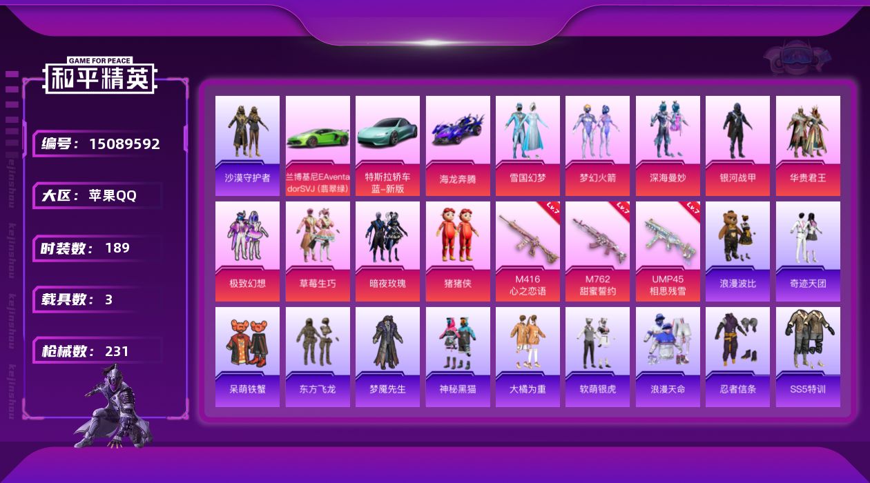 [15089592]素材身法号 苹果 手Q-9粉装-3特效枪-3载具-1粉色飞行器-7.9w热力值-7王牌印记-189套装-231枪皮【热门品类】:粉装-雪国幻梦,粉装-梦幻火箭,套装-浪漫天命,套装-沙漠守护者,套装-忍者信条,套装-浪漫波比,小恶魔头饰【粉色载具】:特斯拉Roadster(水滴蓝),兰博基尼Aventador SVJ(翡翠绿),海龙奔腾【粉色套装】:粉装-深海曼妙,粉装-银河战甲,粉装-雪国幻梦,粉装-梦幻火箭,粉装-华贵君王,粉装-极致幻想,粉装-草莓生巧,粉装-暗夜玫瑰,玩偶服-猪猪侠【粉色枪皮等级】:M416-心之恋语(七级),M762-甜蜜誓约(七级),UMP45-相思残雪(七级)【粉色飞行器】:梦幻火箭飞行器
