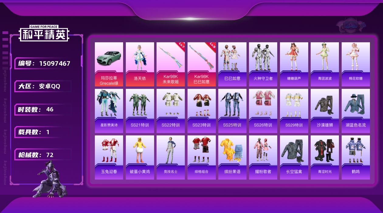 [15097467]不可二次【店主推荐捡漏号!可直接换绑】/地铁满天赋 安卓 手Q-1粉装-2特效枪-1载具-2.4w热力值-2王牌印记-46套装-72枪皮【粉色载具】:玛莎拉蒂Grecale(薄荷绿)【粉色套装】:角色-洛天依【粉色枪皮等级】:Kar98K-未来歌姬(七级),Kar98K-巳巳如意(五级)
