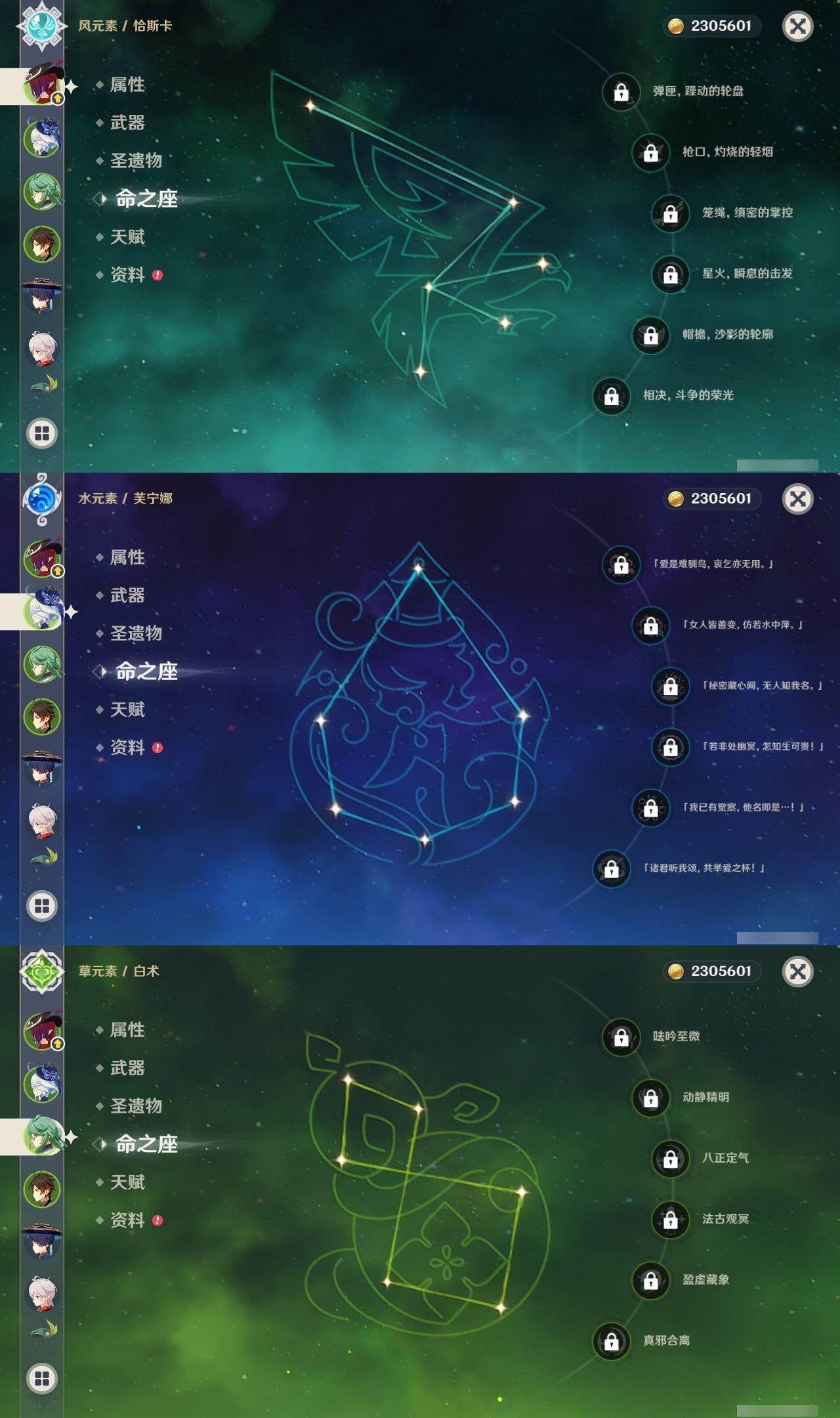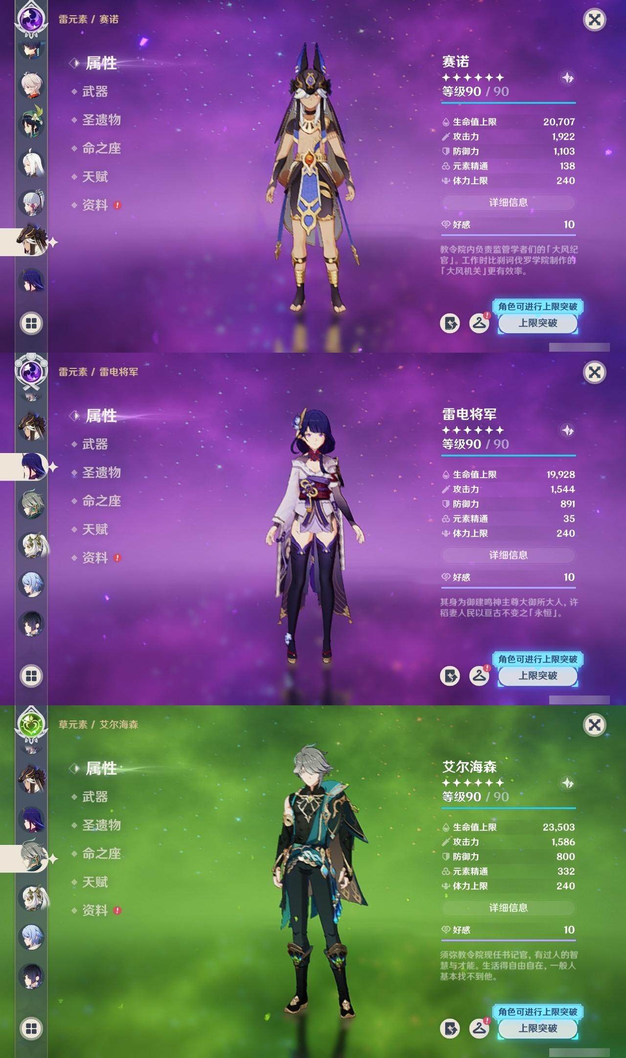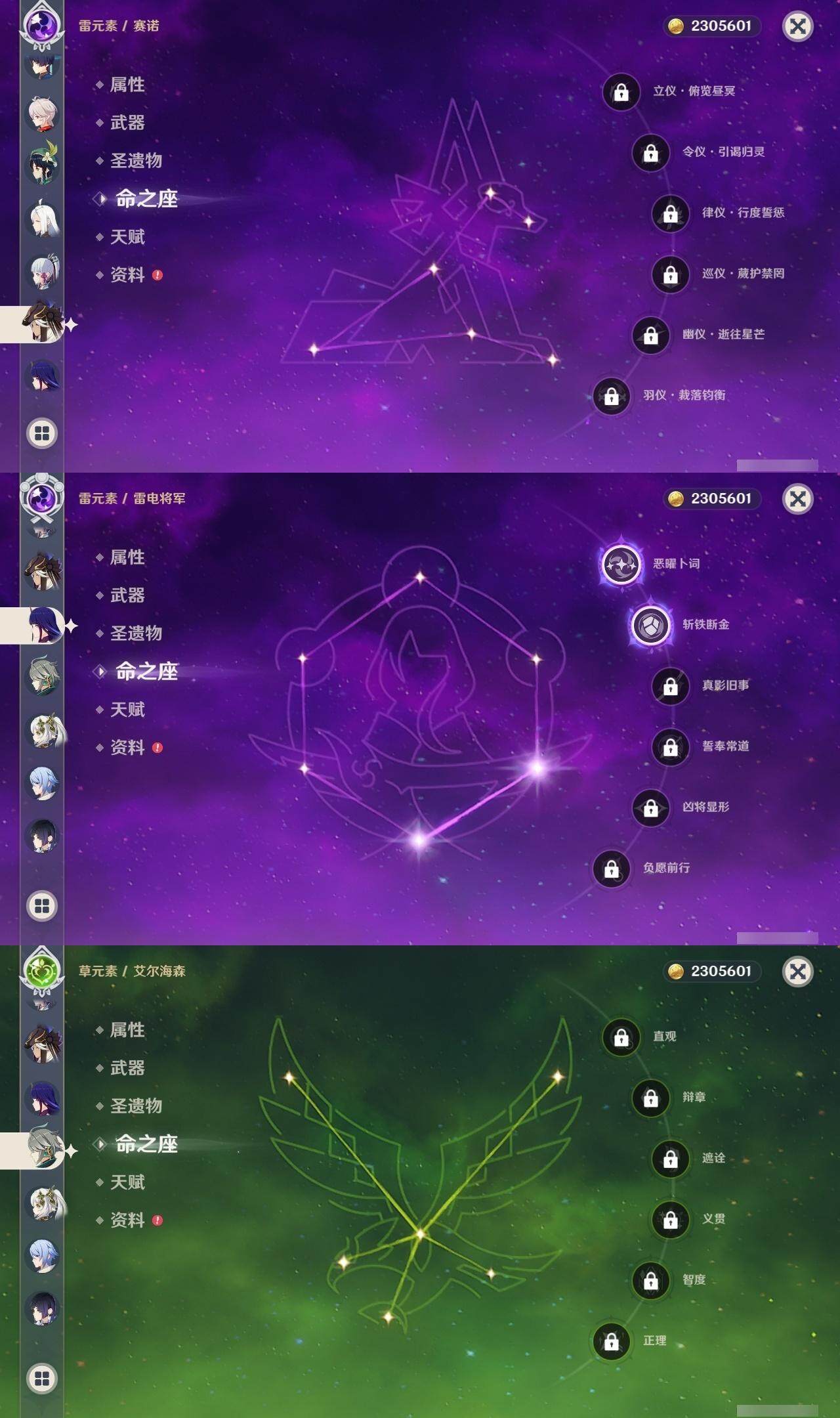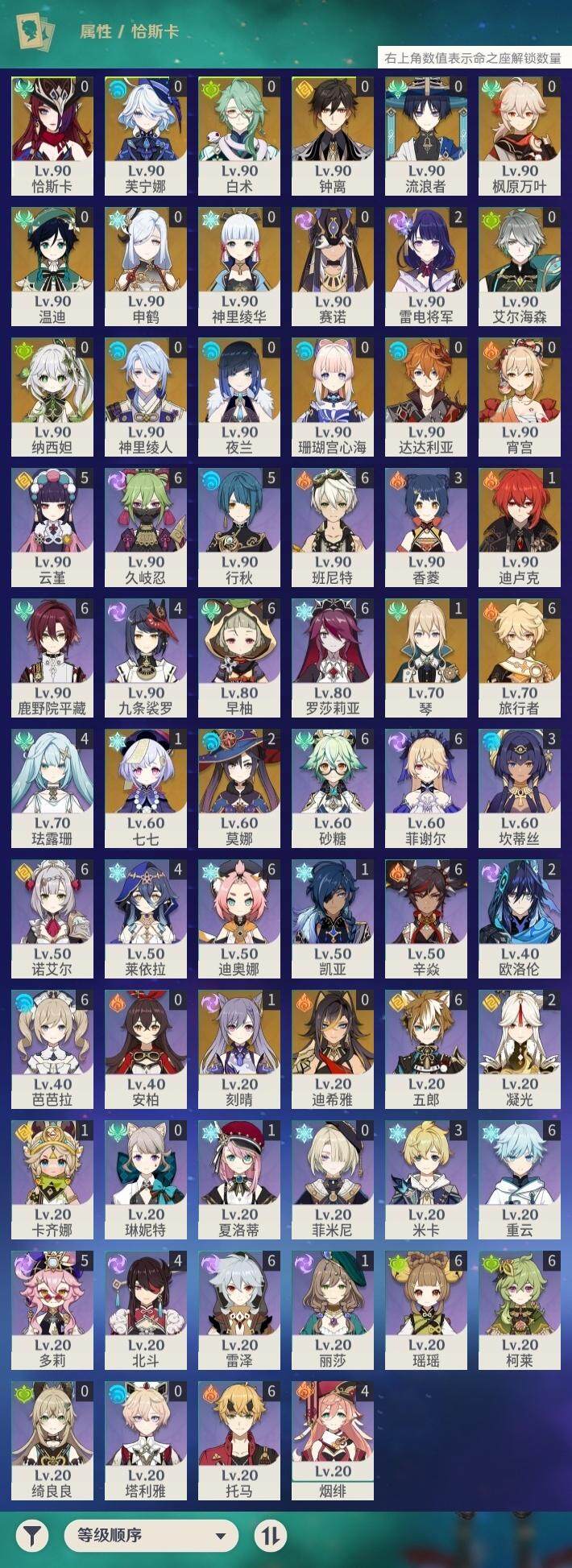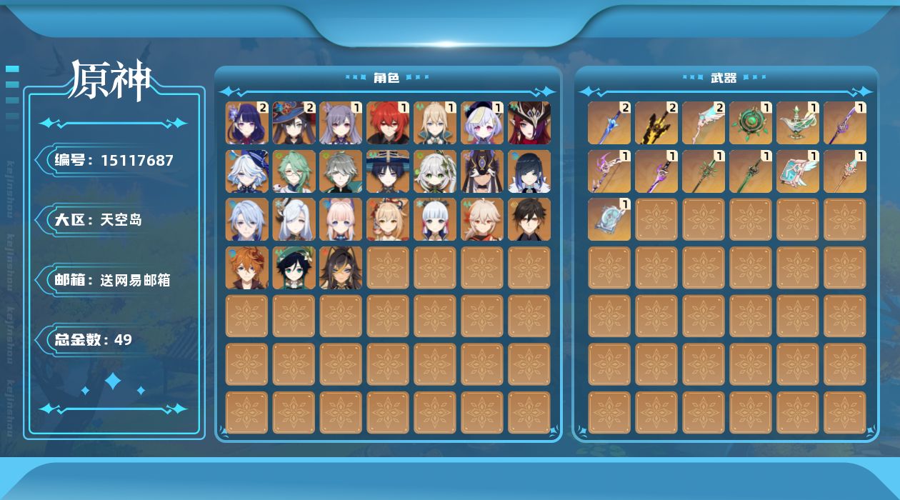 0命芙宁娜,0命白术,0命迪希雅,0命艾尔海森,0命流浪者,0命纳西妲,0命赛诺,0命夜兰,0命神里绫人,0命申鹤,2命雷电将军,0命枫原万叶,0命神里绫华,0命钟离,0命宵宫,0命温迪,0命达达利亚,0命珊瑚宫心海,1命刻晴,1命七七,1命琴,2命莫娜,1命迪卢克,0命恰斯卡,精1碧落之珑,精1千夜浮梦,精2波乱月白经津,精1薙草之稻光,精1飞雷之弦振,精1雾切之回光,精2无工之剑,精1磐岩结绿,精1四风原典,精1和璞鸢,精1天空之脊,精2天空之翼,精1天空之卷