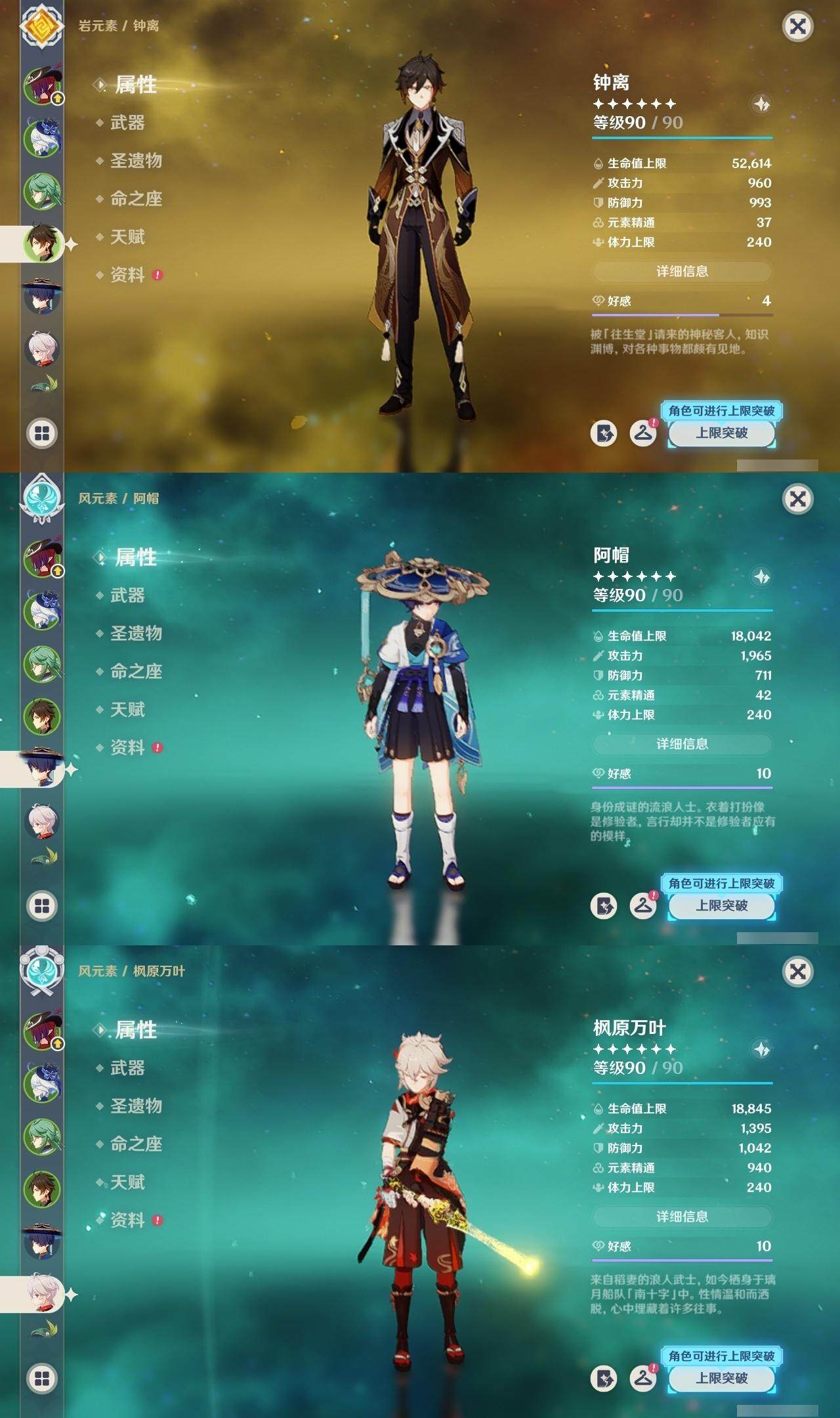 钟离,枫原万叶,温迪,申鹤,神里凌华,雷电将军,珊瑚宫心海,达达利亚,宵宫,迪卢克,琴,七七,莫娜,刻晴