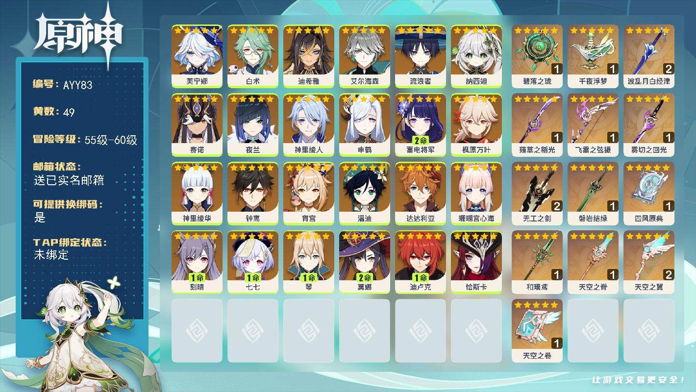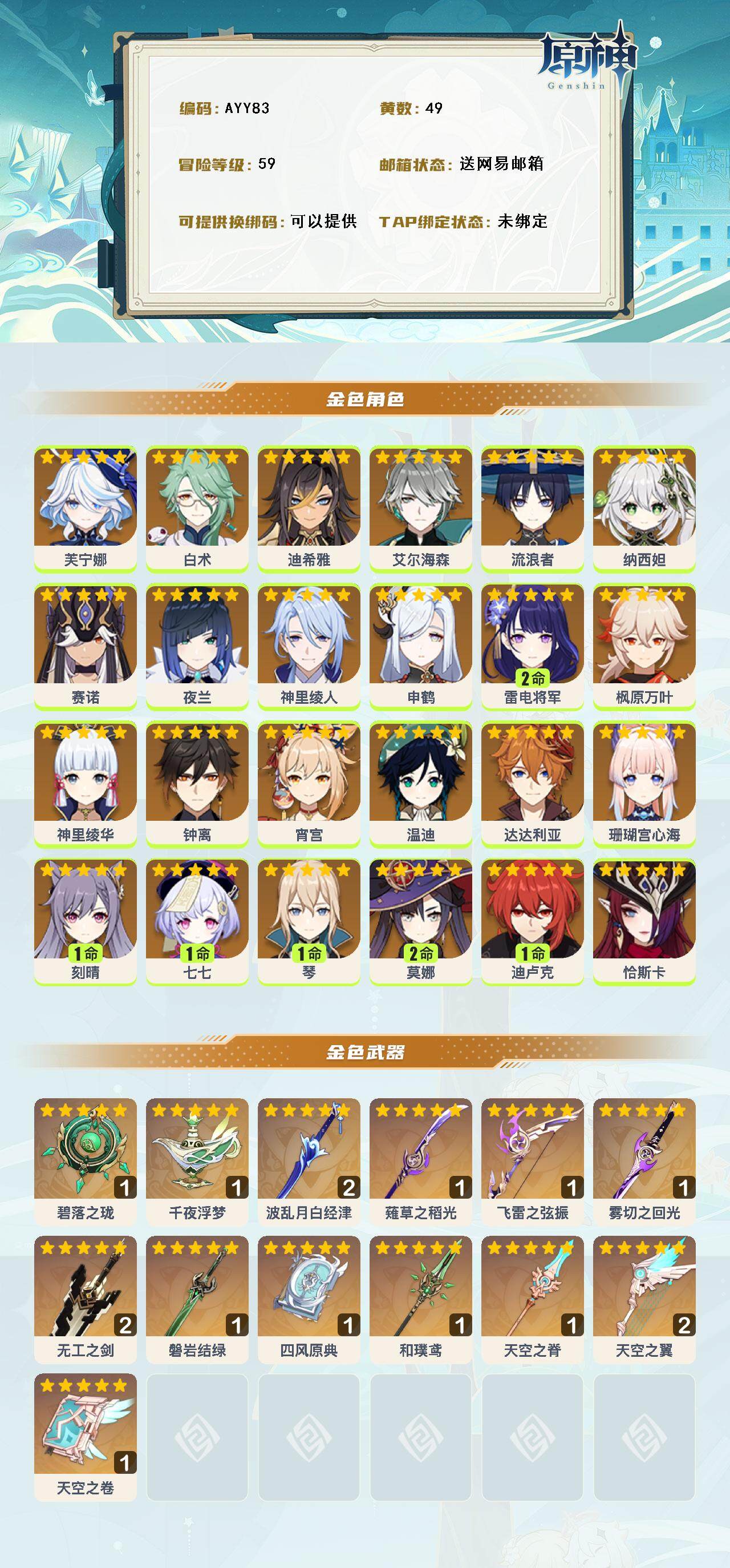 [15117687]59级/49黄/男主/24个五星角色/14个五星武器 0命芙宁娜,0命白术,0命迪希雅,0命艾尔海森,0命流浪者,0命纳西妲,0命赛诺,0命夜兰,0命神里绫人,0命申鹤,2命雷电将军,0命枫原万叶,0命神里绫华,0命钟离,0命宵宫,0命温迪,0命达达利亚,0命珊瑚宫心海,1命刻晴,1命七七,1命琴,2命莫娜,1命迪卢克,0命恰斯卡,精1碧落之珑,精1千夜浮梦,精2波乱月白经津,精1薙草之稻光,精1飞雷之弦振,精1雾切之回光,精2无工之剑,精1磐岩结绿,精1四风原典,精1和璞鸢,精1天空之脊,精2天空之翼,精1天空之卷