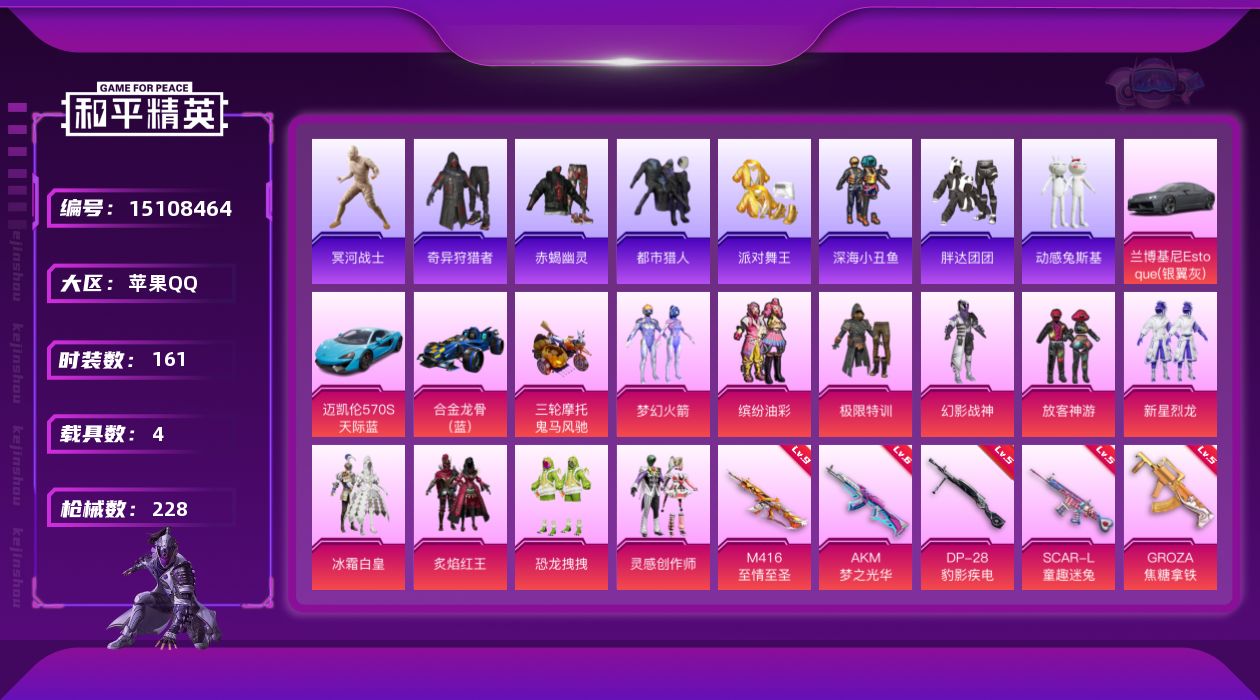 - PX_2095514- 苹果手Q-17王牌印记-有战神框-9粉装-11特效枪-0载具-102708热力值-239套装-312枪皮-2卓越印记-1传奇印记 【9粉装】,梦幻火箭,宝贝奶油派,天使彩虹糖,幻彩电音,智耀战神,花间之火,星之信仰,莲影清波,香水柠檬 【11特效枪】AKM-甜心宝贝-7级 SCAR-L-锦绣绵绵-5级 M416-至情至圣-9级 GROZA-镜光银凌-5级 AUG-暖羊咩咩-