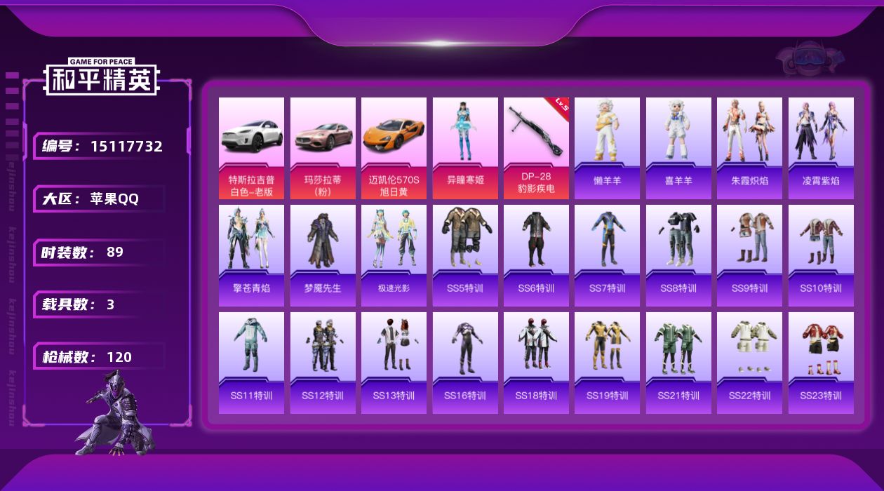 [15117732]可二次【店主推荐捡漏号!可直接换绑】 苹果 手Q-1粉装-1特效枪-3载具-1粉色飞行器-3.6w热力值-15王牌印记-89套装-120枪皮=【热门品类】:绝对防御上衣【粉色载具】:特斯拉Model X(珍珠白),玛莎拉蒂Ghibli(粉),迈凯伦570S(旭日黄)【粉色套装】:角色-异瞳寒姬【粉色枪皮等级】:DP-28-豹影疾电(五级)