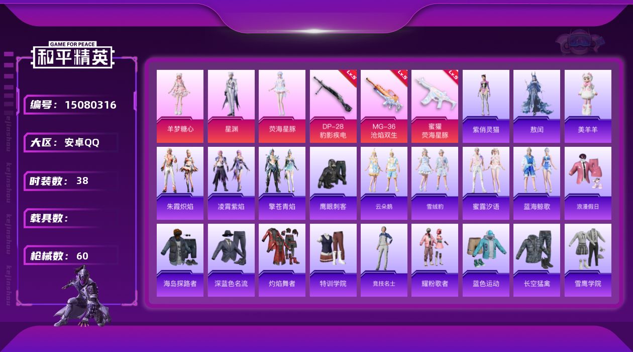 [15080316]【店主推荐捡漏号!可直接换绑】 安卓 手Q-3粉装-3特效枪-1粉色飞行器-1.6w热力值-2王牌印记-38套装-60枪皮【粉色套装】:角色-荧海星豚,角色-星渊,角色-羊梦糖心【粉色枪皮等级】:蜜獾-荧海星豚(五级),DP-28-豹影疾电(五级),MG-36-沧焰双生(五级)【粉色飞行器】:极意拳锋飞行器