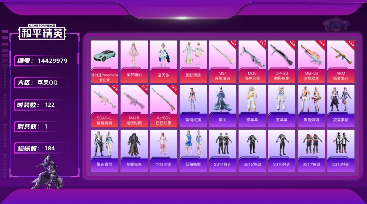 [14429979]可二次【店主推荐捡漏号!可直接换绑】/素材身法号 苹果 手Q-3粉装-8特效枪-1载具-4粉色飞行器-6w热力值-12王牌印记-122套装-184枪皮【热门品类】:套装-粉红小猪【粉色载具】:保时捷Panamera(梦幻青)【粉色套装】:角色-洛天依,粉装-莲影清波,角色-羊梦糖心【粉色枪皮等级】:AKM-绿萝繁花(五级),SCAR-L-锦绣绵绵(五级),M416-电玩时刻(五级),Kar98K-巳巳如意(五级),M24-莲影清波(七级),DP-28-豹影疾电(五级),MG3-洛神天依(七级),MG-36-沧焰双生(五级)【粉色飞行器】:神秘黑猫飞行器,齐天大圣飞行器,太空嘟嘟飞行器