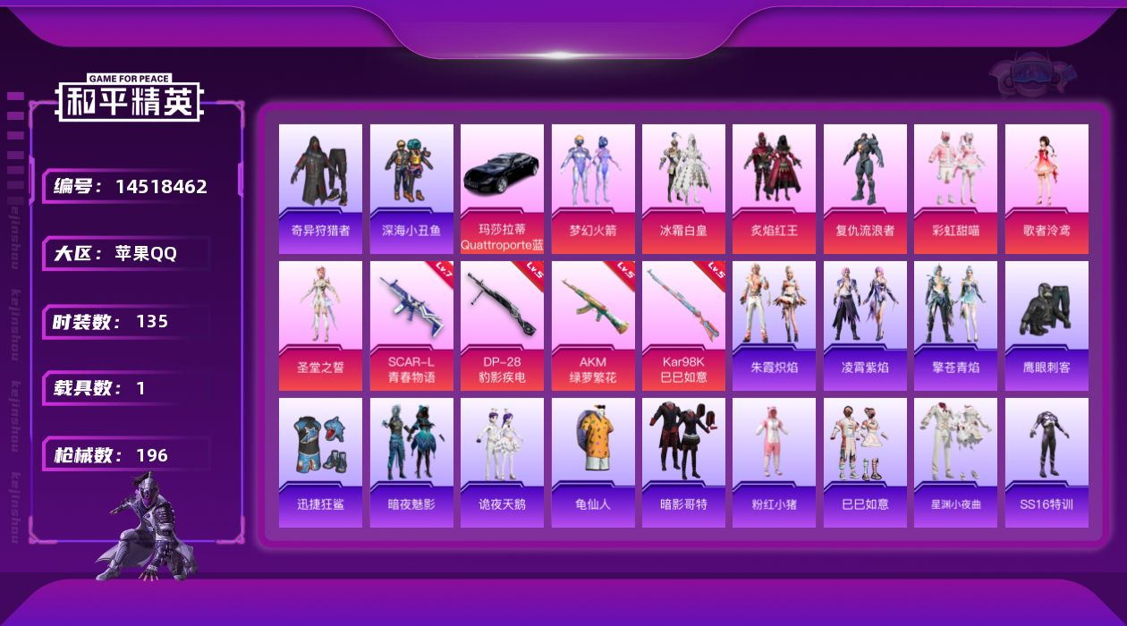 - [13568826]素材身法号/无敌战神框1/绝世印记1 苹果 微信-无敌战神框-15粉装-13特效枪-3载具-4粉色飞行器-7.6w热力值-14王牌印记-163套装-213枪皮【热门品类】:粉装-怪诞乔克,粉装-雪国幻梦,粉装-梦幻火箭,套装-都市猎人,套装-派对舞王,套装-深海小丑鱼,套装-暗夜行者,角色-2B战斗服款,角色-忠真马岱,套装-暗夜之虎,套装-龟仙人,套装-粉红小猪,角色-六号稻草人,小丑红鼻头,大砍刀-青龙偃月刀,撬棍-龙胆亮银枪【粉色载具】:合金龙骨(蓝),赤兔,护世瑞兽【粉色套装】:粉装-怪诞乔克,粉装-雪国幻梦,粉装-梦幻火箭,粉装-放客神游,粉装-新星烈龙,角色-初号机款机体服,粉装-恐龙拽拽,角色-歌者泠鸢,粉装-第五大道,粉装-黄族统领,角色-呆萌星弥,角色-小可学妹,粉装-未来歌姬,粉装-炫光之旅,角色-圣堂之誓【粉色枪皮等级】:AKM-星际浪客(七级),AKM-绿萝繁花(一级),SCAR-L-金蛇镇世(六级),M416-五爪金龙(七级),GROZA-镜光银凌(五级),AUG-暖羊咩咩(五级),AUG-圣斗士星矢(六级),Kar98K-巳巳如意(五级),AMR-炫光之旅(一级),AMR-智耀战神(四级),DP-28-豹影疾电(五级),破片手榴弹-瓶中星球(一级)【粉色飞行器】:梦幻火箭飞行器,超新星飞行器,幽焰列车飞行器,万象金身飞行器