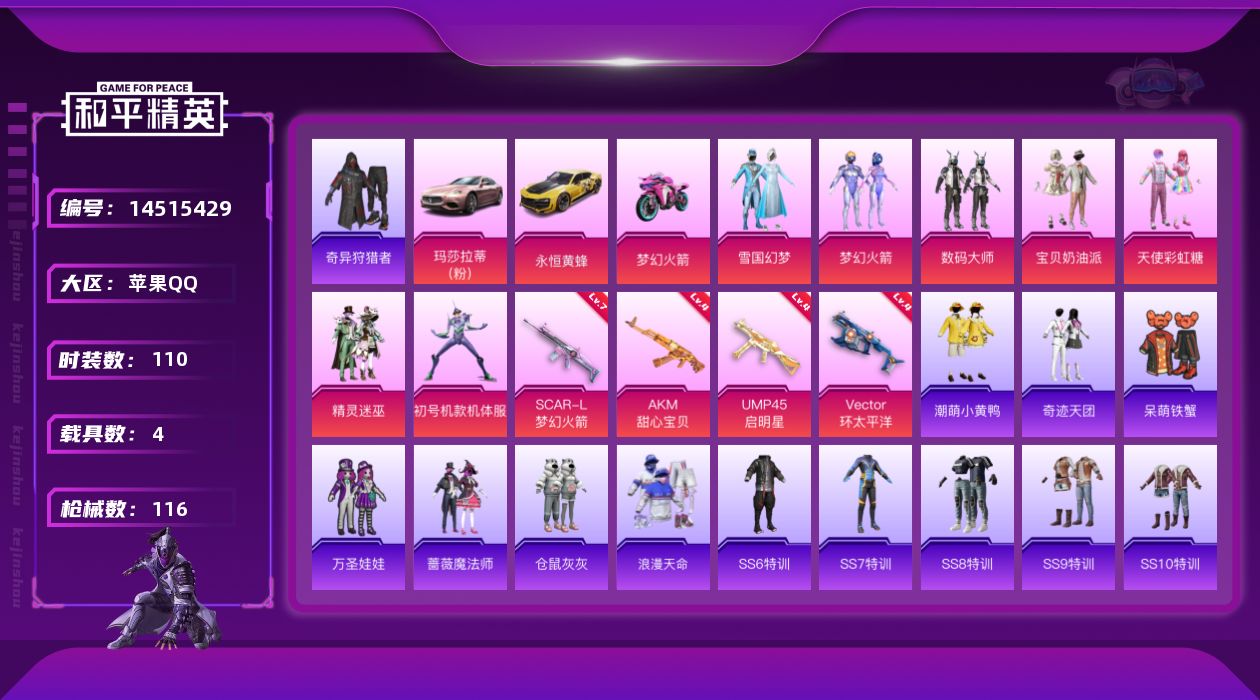 [14515429]可二次【店主推荐捡漏号!可直接换绑】/ 素材身法号 苹果 手Q-7粉装-4特效枪-4载具-3粉色飞行器-4.6w热力值-9王牌印记-110套装-116枪皮【热门品类】:粉装-雪国幻梦,粉装-梦幻火箭,套装-浪漫天命,套装-奇异狩猎者,套装-潮萌小黄鸭【粉色载具】:玛莎拉蒂Ghibli(粉),永恒黄蜂,双人摩托-梦幻火箭,僚机-萌兔起飞【粉色套装】:粉装-数码大师,粉装-宝贝奶油派,粉装-天使彩虹糖,粉装-雪国幻梦,粉装-精灵迷巫,粉装-梦幻火箭,角色-初号机款机体服【粉色枪皮等级】:AKM-甜心宝贝(四级),SCAR-L-梦幻火箭(七级),UMP45-启明星(四级),Vector-环太平洋(四级)【粉色飞行器】:精灵迷巫飞行器,梦幻火箭飞行器,星际浪客飞行器