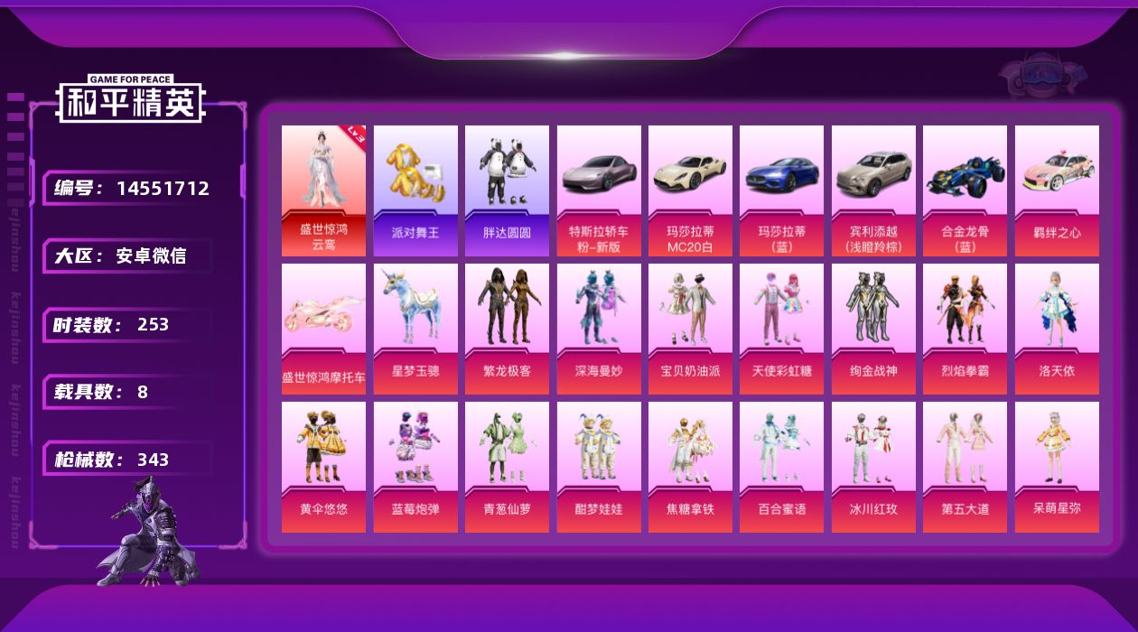 [14551712]素材身法号/无敌战神框2/绝世印记9 安卓 微信-无敌战神框-1神装-23粉装-17特效枪-8载具-11粉色飞行器-14.1w热力值-23王牌印记-253套装-343枪皮【红色神装等级】:盛世惊鸿-云鸾(三级)【热门品类】:粉装-繁龙极客,绝对防御上衣,套装-派对舞王,套装-小丑鱼,角色-军刀雅典娜,套装-胖达圆圆,套装-龟仙人,套装-暗影哥特,套装-浪漫波比,套装-粉红小猪,角色-Mark.06,撬棍-龙胆亮银枪【粉色载具】:特斯拉Roadster(沁心粉),玛莎拉蒂MC20(星石白),玛莎拉蒂Ghibli(蓝),宾利添越(浅瞪羚棕),合金龙骨(蓝),羁绊之心,盛世惊鸿摩托车,星梦玉骢【粉色套装】:粉装-深海曼妙,粉装-宝贝奶油派,粉装-天使彩虹糖,粉装-绚金战神,粉装-烈焰拳霸,角色-洛天依,粉装-黄伞悠悠,粉装-蓝莓炮弹,粉装-青葱仙萝,粉装-酣梦娃娃,粉装-焦糖拿铁,粉装-百合蜜语,粉装-冰川红玫,粉装-第五大道,角色-呆萌星弥,角色-小可学妹,粉装-闲梦青缨,角色-圣堂之誓,粉装-繁龙极客,角色-烟云彩露,角色-星梦奇缘,角色-初号机 觉醒Ver.,角色-樱桃泡泡【粉色枪皮等级】:AKM-百合蜜语(七级),SCAR-L-锦绣绵绵(五级),M416-五爪金龙(七级),M416-风花雪月(四级),M416-电玩时刻(五级),GROZA-焦糖拿铁(七级),GROZA-镜光银凌(五级),AUG-暖羊咩咩(五级),M762-激战未来(七级),UMP45-量子极限(五级),Kar98K-巳巳如意(五级),Mini14-绚金瑰梦(四级),Mk14-盛世惊鸿(三级),M249-蓝莓炮弹(四级),DP-28-圣堂之誓(五级),DP-28-豹影疾电(五级),MG3-洛神天依(七级)【粉色飞行器】:夏日绵绵冰飞行器,风花雪月飞行器,甜心娃娃飞行器,繁龙极客飞行器,镜域双华-灵镜之阶,绝色倾城飞行器,星梦奇缘飞行器,深渊漩涡飞行器,凤舞九天飞行器,万象金身飞行器