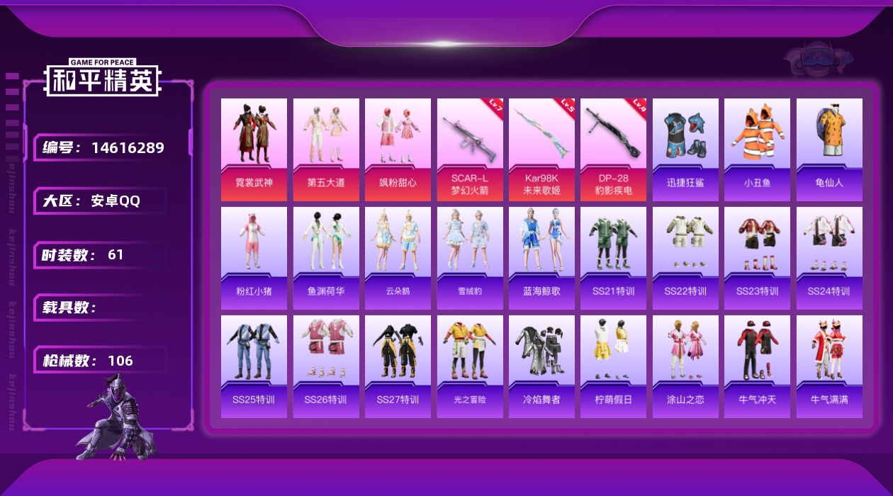 [14616289]【店主推荐捡漏号!可直接换绑】 安卓 手Q-3粉装-3特效枪-1粉色飞行器-2.9w热力值-1王牌印记-61套装-106枪皮【热门品类】:套装-小丑鱼,套装-龟仙人,套装-粉红小猪【粉色套装】:粉装-霓裳武神,粉装-第五大道,粉装-飒粉甜心【粉色枪皮等级】:SCAR-L-梦幻火箭(七级),Kar98K-未来歌姬(五级),DP-28-豹影疾电(四级)【粉色飞行器】:太空嘟嘟飞行器