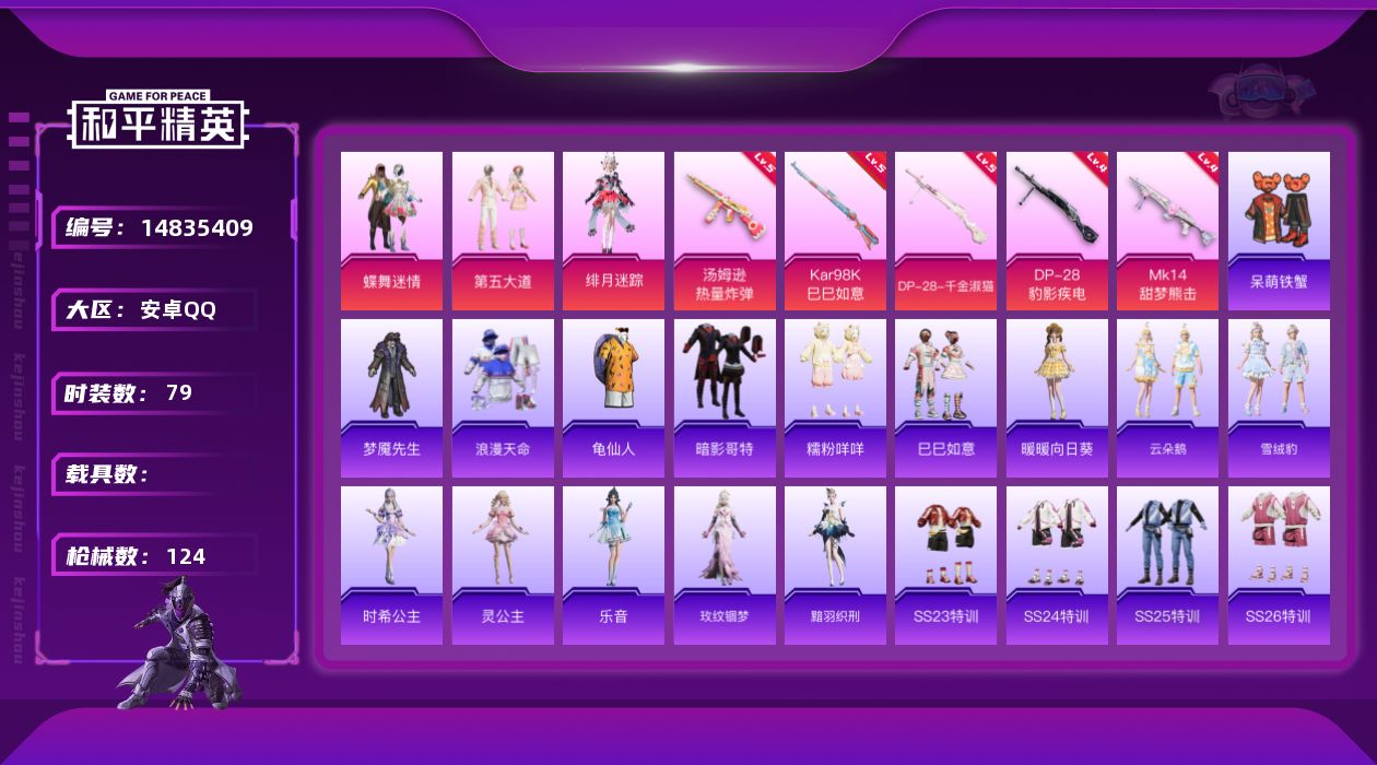 - [14011494]安卓 手Q-无敌战神框-2神装-53粉装-18特效枪-9载具-8粉色飞行器-141512热力值-12王牌印记-242套装-267枪皮 【红色载具】:宾利飞驰(皇家紫)(一级) 【红色神装等级】:精灵之光-露米娜(二级),角色-青焰关公(一级) 【红色角色神装】:精灵之光-露米娜,角色-青焰关公 【热门品类】:粉装-怪诞乔克,粉装-雪国幻梦,粉装-梦幻火箭,粉装-童趣迷兔,粉装-缤纷油彩,粉装-彩装战姬,套装-赤蝎幽灵,套装-都市猎人,套装-派对舞王,套装-深海小丑鱼,套装-小丑鱼,套装-胖达团团,套装-胖达圆圆,角色-忠猛周仓,角色-忠真马岱,角色-忠义严颜,套装-龟仙人,套装-暗影哥特,套装-糯粉咩咩,小丑红鼻头,大砍刀-青龙偃月刀,撬棍-龙胆亮银枪 【粉色载具】:宾利欧陆GT敞篷(火焰橘),宾利飞驰(皇家紫),仰望U7(阿盖尔紫),帕加尼imola(光影红),合金龙骨(绿),萌喵橘座,僚机-萌兔起飞,赤兔,照夜玉狮子,星梦玉骢 【粉色套装】:粉装-怪诞乔克,粉装-甜心巧克力,粉装-宝贝奶油派,粉装-天使彩虹糖,粉装-雪国幻梦,粉装-梦幻火箭,粉装-缤纷油彩,粉装-放客神游,粉装-星空之魅,粉装-花间之火,粉装-冰霜白皇,粉装-童趣迷兔,粉装-炙焰红王,粉装-馨动时刻,角色-洛天依,粉装-焦糖拿铁,粉装-恐龙拽拽,粉装-橘柚倾心,粉装-甜梦小狐,粉装-暖熊萌萌,粉装-灵感创作师,粉装-彩虹甜喵,粉装-旋转彩虹,粉装-冰川粉黛,粉装-冰川幽秘,粉装-冰川红玫,粉装-银红美神,粉装-霞光圣骑,粉装-寒光使者,角色-歌者泠鸢,粉装-暗夜鎏金,粉装-第五大道,粉装-纯珍童话,粉装-仲夏莫吉托,粉装-飒粉甜心,角色-白勺歌姬,角色-呆萌星弥,角色-小可学妹,粉装-萌物绒绒,角色-宙之时溯,角色-星云暗核,粉装-莲影清波,粉装-彩装战姬,粉装-憨憨奶龙,角色-圣堂之誓,角色-小叽联名款,玩偶服-猪猪侠,角色-烟云彩露,角色-严莉莉,角色-小蓝,角色-美琪,粉装-金丰海韵,粉装-星穹咏叹调 【粉色枪皮等级】:AKM-星际浪客(四级),AKM-魔法神域(六级),SCAR-L-万古烈焰(八级),SCAR-L-时空协奏(三级),M416-暖熊萌萌(三级),M416-超新星(九级),GROZA-旋转彩虹(一级),GROZA-精灵之光(五级),M762-电糖天使(四级),UMP45-相