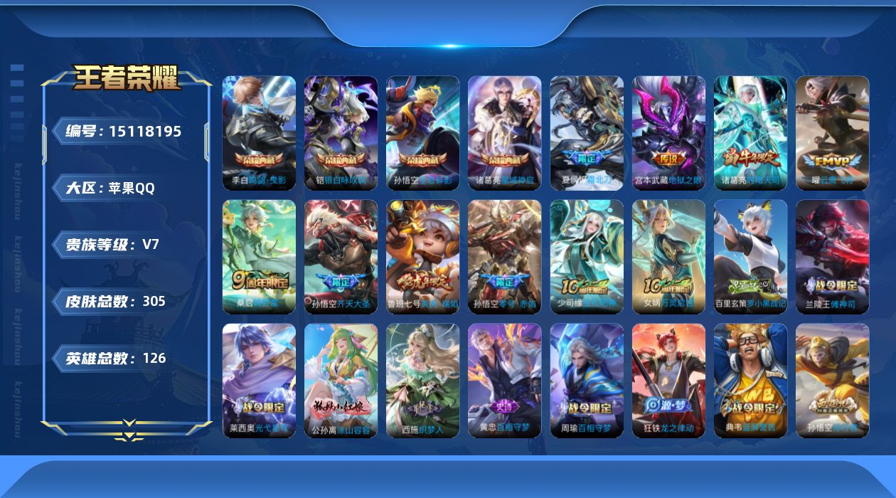 [15118195]【店主推荐捡漏号!可直接换绑】苹果Q-V7-最强王者段位-126英雄-305皮肤-4典藏皮肤-9传说-86史诗
