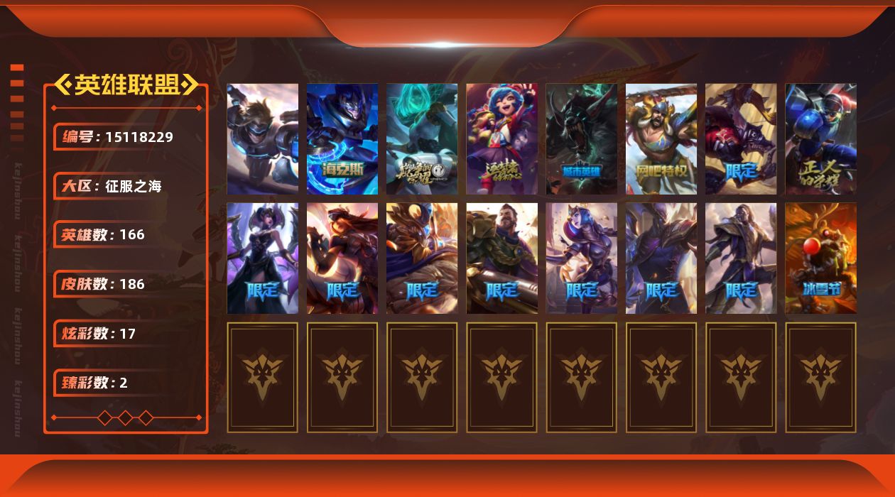 [15118229]可二次【店主推荐捡漏号!可直接换绑】青铜段位-166英雄-186皮肤-17炫彩-1终极-4神话-13限定-22传说-53史诗