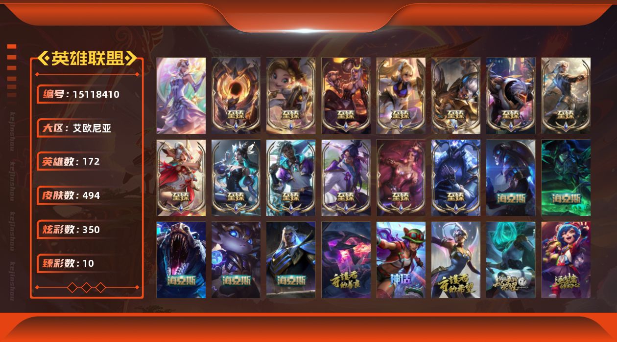 黄金段位-172英雄-494皮肤-350炫彩-1终极-24神话-61限定-49传说-112史诗