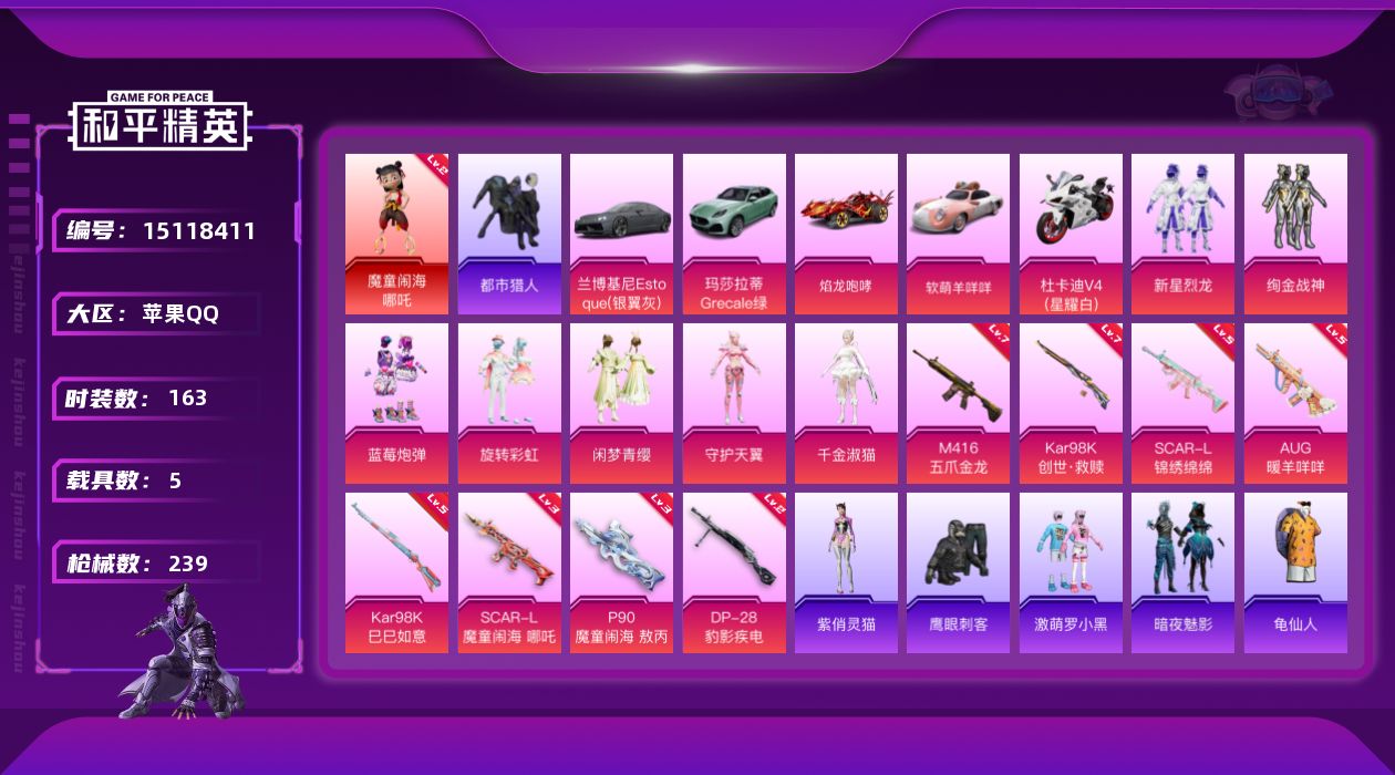 - [15141826]【暑期末清货/特价急出/永久包赔】:苹果 手Q-22粉装-8特效枪-6载具-10.5w热力值-15印记-228套装-273枪皮【热门品类】:套装-深海小丑鱼,套装-小丑鱼,套装-奇异狩猎者,套装-动感兔斯基人偶服【稀有载具】:特斯拉Roadster(沁心粉),玛莎拉蒂Ghibli(粉),宾利BATUR(星火红),Formula E Gen2(幽光蓝),萌喵橘座,晶梦灵驹【稀有载具等级】:宾利BATUR(星火红)(二级)【特效枪等级】:AKM-梦之光华(六级),SCAR-L-童趣迷兔(七级),M416-心之恋语(七级),UMP45-恐龙拽拽(七级),Kar98K-伏魔团(五级),Kar98K-巳巳如意(五级),SLR-暗夜玫瑰(五级),SPAS-12-蜜语绒猫(三级)【优质套装】:粉装-粉色回忆,粉装-雪国幻梦,粉装-梦幻火箭,粉装-华贵君王,粉装-彗云及圣,粉装-炙焰红王,粉装-暗夜玫瑰,粉装-彩虹鹿灵,粉装-山涧鹿灵,粉装-蓝莓炮弹,粉装-寒光使者,粉装-闲梦青缨,角色-茉莉星,粉装-繁龙极客,套装-创世·救赎,角色-初号机 觉醒Ver.,角色-千金淑猫,角色-伏羲圣卦,角色-女娲灵识,角色-晶梦幻蝶,粉装-幻彩电音,角色-荧海星豚【优质飞行器】:酣梦熊熊飞行器,伏魔团飞行器,相思残雪飞行器,繁龙极客飞行器