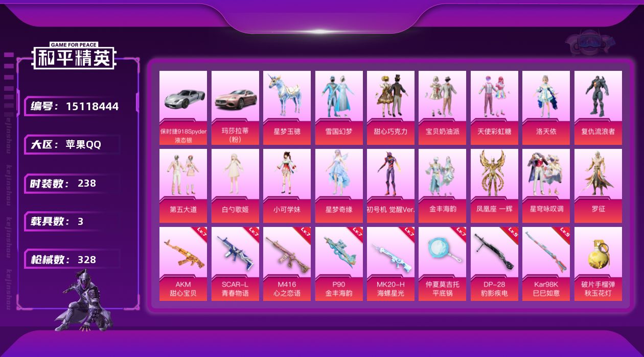 [15118444]【店主推荐捡漏号!可直接换绑】/素材身法号/扭蛋碎片874 苹果 手Q-15粉装-9特效枪-3载具-4粉色飞行器-10.8w热力值-17王牌印记-238套装-328枪皮【热门品类】:粉装-雪国幻梦,套装-SS1特训,套装-龟仙人,套装-粉红小猪,角色-Mark.06【粉色载具】:玛莎拉蒂Ghibli(粉),保时捷918 Spyder(液态银),星梦玉骢【粉色套装】:粉装-甜心巧克力,粉装-宝贝奶油派,粉装-天使彩虹糖,粉装-雪国幻梦,角色-洛天依,角色-复仇流浪者,粉装-第五大道,角色-白勺歌姬,角色-小可学妹,角色-星梦奇缘,角色-初号机 觉醒Ver.,粉装-金丰海韵,角色-凤凰座 一辉,粉装-星穹咏叹调,角色-罗征【粉色枪皮等级】:AKM-甜心宝贝(七级),SCAR-L-青春物语(七级),M416-心之恋语(七级),P90-金丰海韵(七级),Kar98K-巳巳如意(五级),MK20-H-海螺星光(七级),DP-28-豹影疾电(五级),平底锅-仲夏莫吉托(七级)【粉色飞行器】:庄周梦蝶飞行器,深渊漩涡飞行器,灵猫魔法师飞行器,飞天猪飞行器