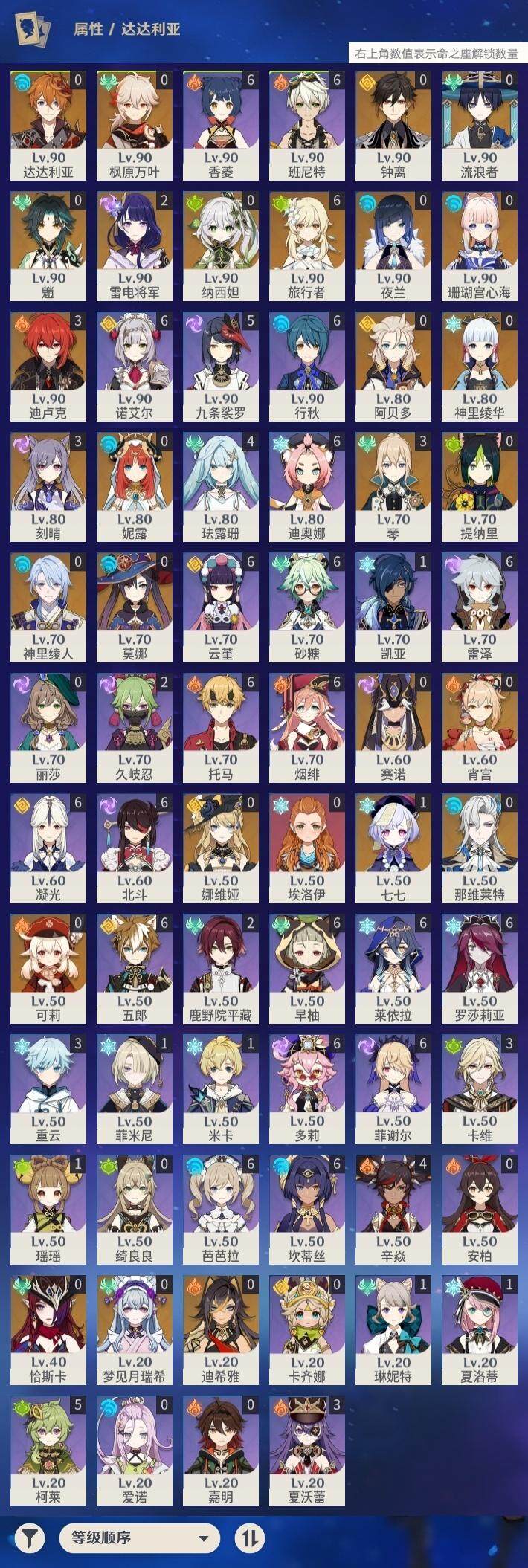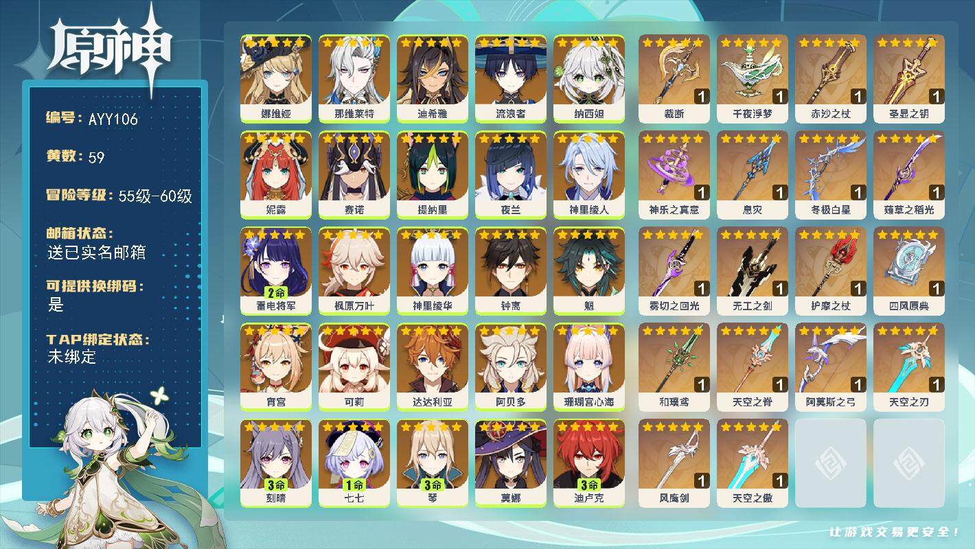 [15121722]60级/59黄/女主/27个五星角色/20个五星武器 0命娜维娅,0命那维莱特,0命迪希雅,0命流浪者,0命纳西妲,0命妮露,0命赛诺,0命提纳里,0命夜兰,0命神里绫人,2命雷电将军,0命枫原万叶,0命神里绫华,0命钟离,0命魈,0命宵宫,0命可莉,0命达达利亚,0命阿贝多,0命珊瑚宫心海,3命刻晴,1命七七,3命琴,0命莫娜,3命迪卢克,0命恰斯卡,0命梦见月瑞希,精1裁断,精1千夜浮梦,精1赤沙之杖,精1圣显之钥,精1神乐之真意,精1息灾,精1冬极白星,精1薙草之稻光,精1雾切之回光,精1无工之剑,精1护摩之杖,精1四风原典,精1和璞鸢,精1天空之脊,精1阿莫斯之弓,精1天空之刃,精1风鹰剑,精1天空之傲