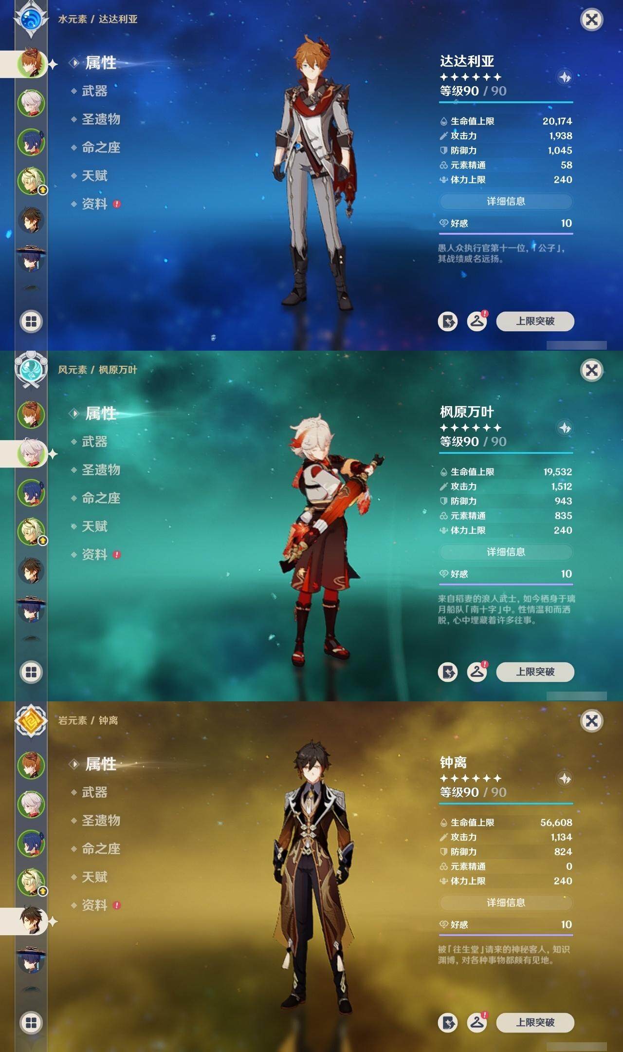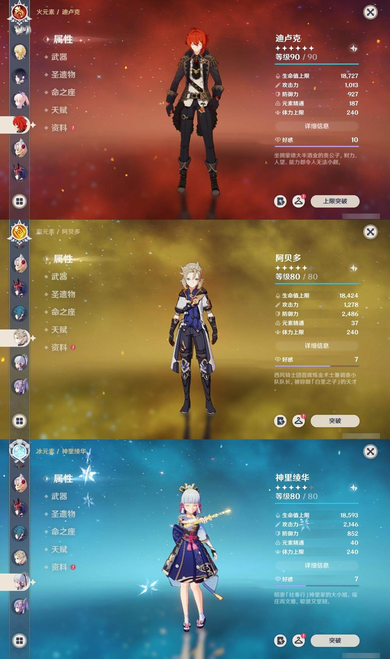 达达利亚,枫原万叶,钟离,魈,雷电将军,珊瑚宫心海,迪卢克,阿贝多,神里凌华,刻晴,琴,莫娜,宵宫,七七,可莉