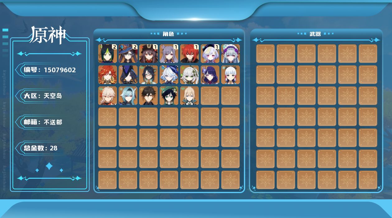 0命克洛琳德,0命闲云,0命芙宁娜,0命纳西妲,2命提纳里,0命优菈,0命雷电将军,0命枫原万叶,0命神里绫华,0命钟离,1命胡桃,0命温迪,1命刻晴,1命七七,0命琴,2命莫娜,1命迪卢克,0命玛薇卡,0命梦见月瑞希,0命杜林