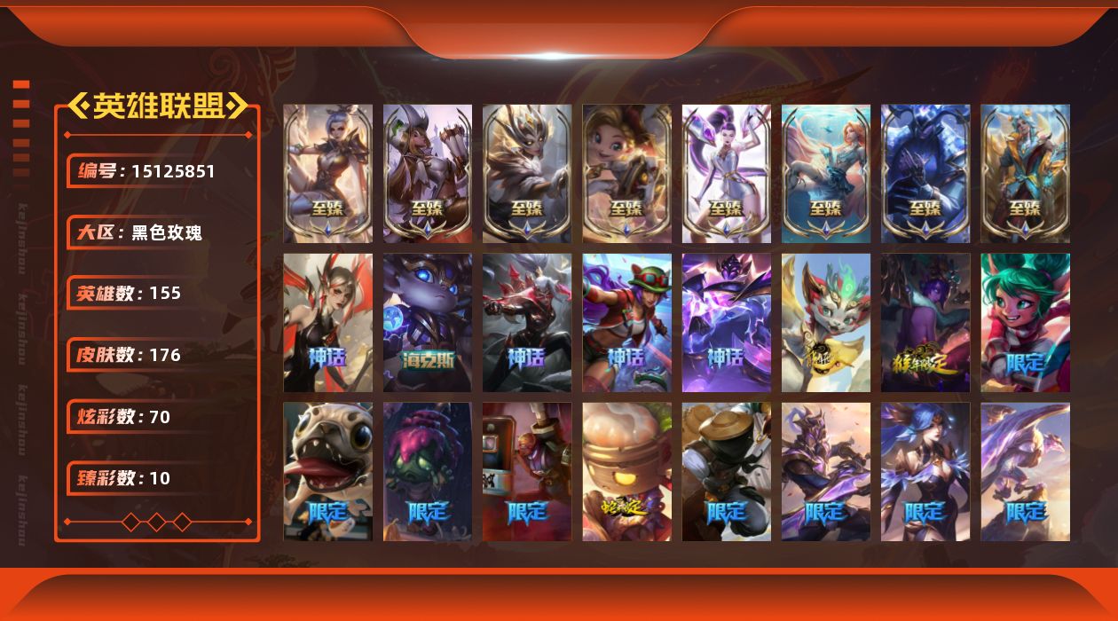 [15125851]36222820020421261X未定级段位-155英雄-176皮肤-70炫彩-0终极-13神话-25限定-19传说-28史诗【至臻皮肤】:至臻魅惑女巫厄运小姐,至臻天龙之子伊泽瑞尔,至臻玉剑传说武剑仙锐雯,至臻奥术师佐伊,至臻魔女婕拉,至臻KDAALLOUT卡莎,至臻海之歌萨勒芬妮,至臻DRX亚托克斯【臻彩皮肤】:冠军典狱长锤石凯旋圣装,冠军之矛卡莉丝塔凯旋圣装,弹幕天使卡莎炽天使勇敢,源计划毁灭派克幻灭,可爱可爱粉红红布里茨,殿堂传奇乐芙兰登神,星之守护者阿卡丽热情之光,战斗学院盖伦不死鸟,魔女阿卡丽虚荣【年限皮肤】:紫金罗刹莫甘娜,天龙之子斯莫德,点心宝贝阿木木【海克斯皮肤】:海克斯科技波比【冰雪限定】:圣诞开心鬼提莫,胡桃夹子萨科,平安夜女神娑娜,圣诞玩偶波比【神话皮肤】:殿堂传奇乐芙兰,十五周年纪念希维尔,殿堂传奇薇恩,水晶巫灵泽拉斯,海克斯科技波比,至臻天龙之子伊泽瑞尔,至臻奥术师佐伊,至臻DRX亚托克斯,至臻海之歌萨勒芬妮,至臻KDAALLOUT卡莎,至臻魅惑女巫厄运小姐,至臻魔女婕拉,至臻玉剑传说武剑仙【限定皮肤】:养蜂人辛吉德,SKTT1劫,SKTT1瑞兹,SKTT1辛德拉,暗裔英雄盖伦,胜利凤凰艾尼维亚,胜利之王泰达米尔,胜利巨口克格莫,胜利女神娑娜,胜利剑圣易,胜利女神菲奥娜,大魔法锅布里茨,鬼影森森茂凯,死亡誓约劫,波比的巧克力工坊,防暴士兵辛吉德,惊悚派对阿木木,克格汪【传说皮肤】:魔幻卡牌崔斯特,大天使长米迦勒凯尔,战场女武神凯尔,恶魔男爵瑞兹,黑夜使者索拉卡,约德尔国队长提莫,绅士科加斯,灵能特工娑娜,红色男爵库奇,最终BOSS维迦,战斗学院凯特琳,神拳李青,死亡骑士盖伦,星之守护者阿狸,光明哨兵格雷福斯,奥德赛凯隐,星之守护者卡莎,魔女娜美,灵魂莲华瑟提【史诗皮肤】:冰霜烈焰安妮,绞肉机角斗士赵信,钢铁之心希维尔,月光女神阿忒弥斯索拉卡,荒野豺狼沃里克,贵族血统萨科,穿着正装的恶魔维迦,古墓丽影凯特琳,霸天巨兽墨菲特,前线指挥官卡特琳娜,符文战神雷克顿,冰晶之核布兰德,四神之力乌迪尔,钢铁意志潘森,冰川勇者伊泽瑞尔,深海怪鱼克格莫,腥红之月鬼武者慎,奥术光辉拉克丝,骸骨之爪希瓦娜,银河魔装机神菲兹,白色死神韦鲁斯,暗黑女武神黛安娜,无限烈焰黛安娜,黯焰双魂千珏,五星大厨塔姆,源计划雷卢锡安,霓虹杀拳蔚,冰雪游神巴德【其他皮肤1】: