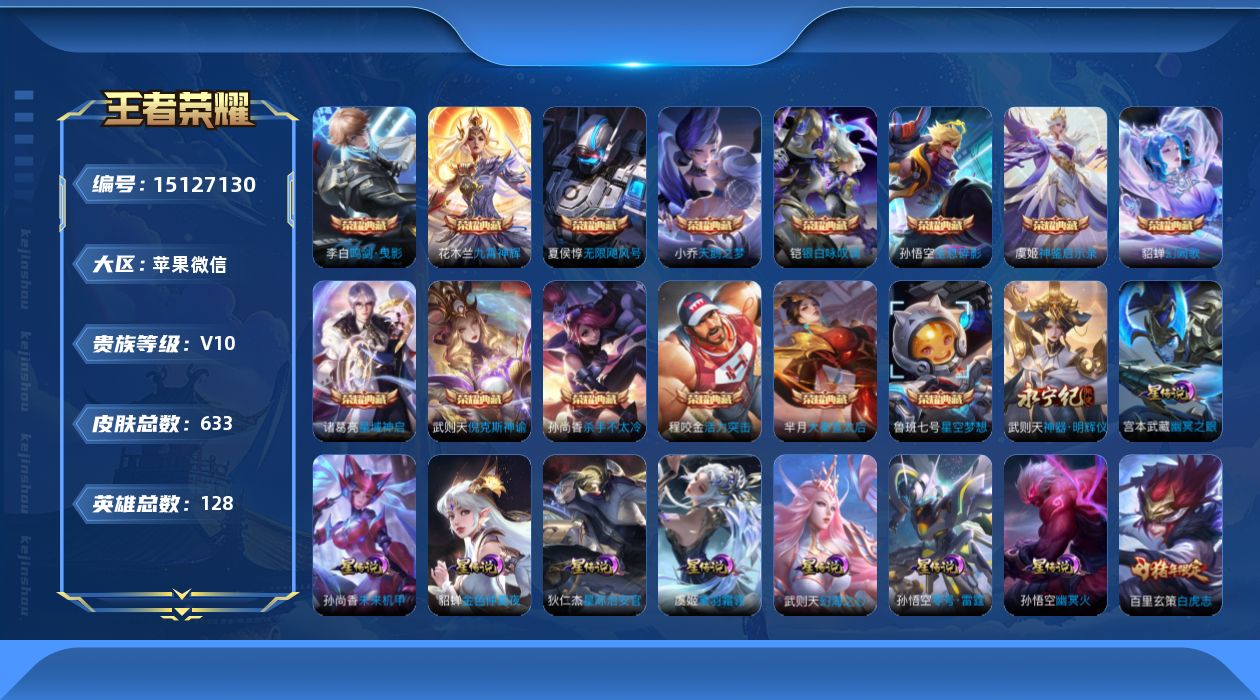 [15127130]苹果WX-V10-最强王者段位-128英雄-633皮肤-14典藏皮肤-1典藏英雄-10星元-1无双-79传说-235史诗