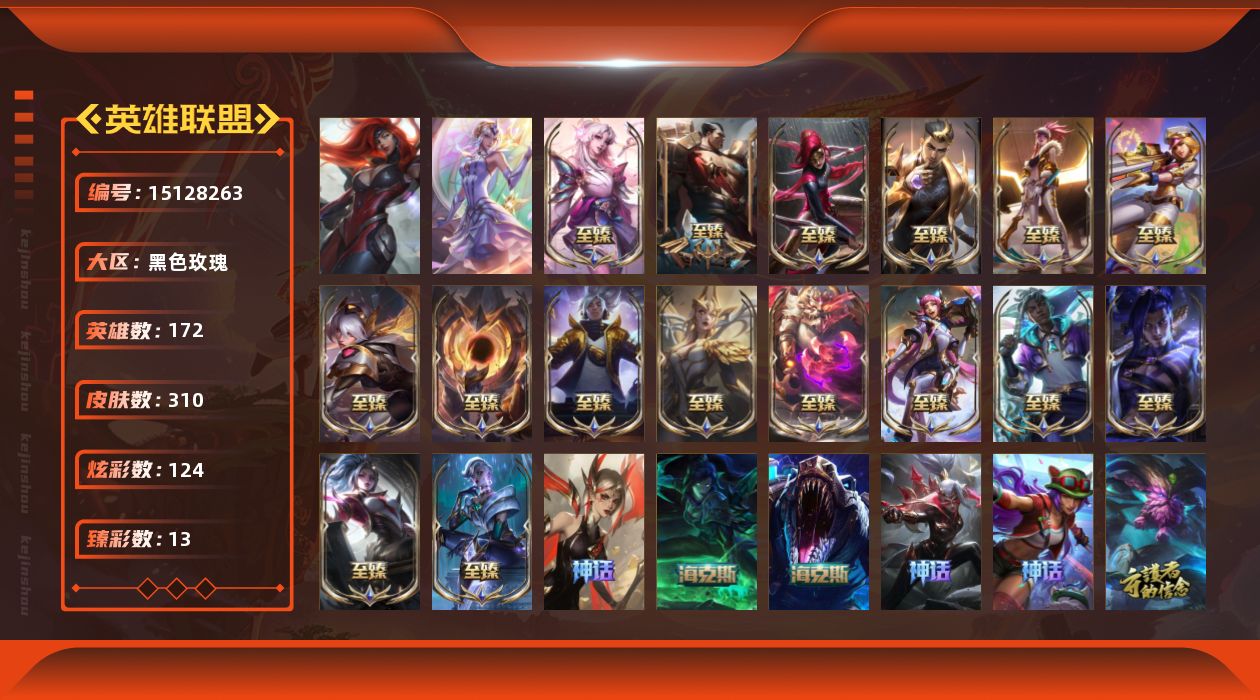 【神话皮肤】:殿堂传奇乐芙兰,十五周年纪念希维尔,殿堂传奇薇恩,永恒之森奥恩,海克斯科技雷克顿,摄魂使者薇恩,至臻真实伤害亚索,至臻至高天奎桑提,至臻暗星墨菲特,至臻北极星钢影卡蜜尔,至臻电玩女神凯特琳,至臻幻灵战斗猫金克丝,至臻KDA阿卡丽,至臻魔女阿卡丽,至臻魔女乐芙兰,至臻神龙尊者均衡之龙沃利贝尔,至臻星之守护者艾克,至臻源计划正义艾瑞莉娅