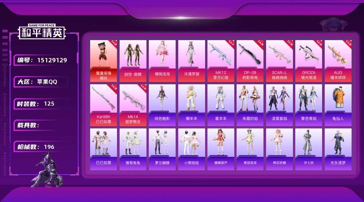 [15129129]【店主推荐捡漏号!可直接换绑】/素材身法号/地铁满天赋 苹果 手Q-1神装-3粉装-7特效枪-3粉色飞行器-5.7w热力值-11王牌印记-125套装-196枪皮【红色神装等级】:魔童闹海-哪吒(二级)【热门品类】:套装-龟仙人【粉色套装】:套装-创世·救赎,角色-樱桃泡泡,角色-冷漠罗丽【粉色枪皮等级】:SCAR-L-锦绣绵绵(五级),GROZA-镜光银凌(五级),AUG-暖羊咩咩(五级),Kar98K-巳巳如意(五级),Mk14-甜梦熊击(五级),MK12-雪月幻音(七级),DP-28-豹影疾电(五级)【粉色飞行器】:智趣喵喵飞行器,极意拳锋飞行器