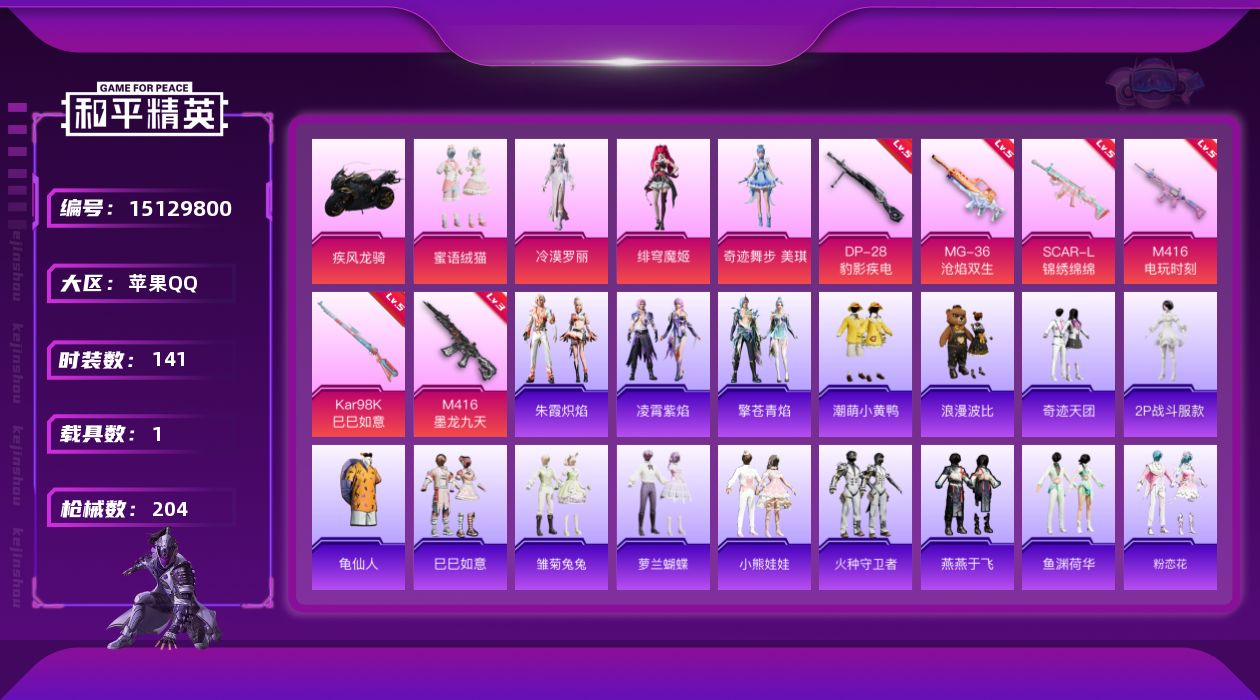 - PX_2059834- 苹果手Q-5王牌印记-11粉装-6特效枪-1载具-64627热力值-163套装-185枪皮-0卓越印记-0传奇印记 【11粉装】,梦幻火箭,蝶舞迷情,冷漠罗丽,PEL轰鸣竞梦者,蜜语绒猫,冰川粉黛,冰川幽秘,冰川红玫,旋转彩虹,朗月武圣,桃夭倾城 【6特效枪】AKM-炫紫旋律-5级 SCAR-L-桃夭倾城-5级 GROZA-旋转彩虹-5级 Kar98K-巳巳如意-5级 MK