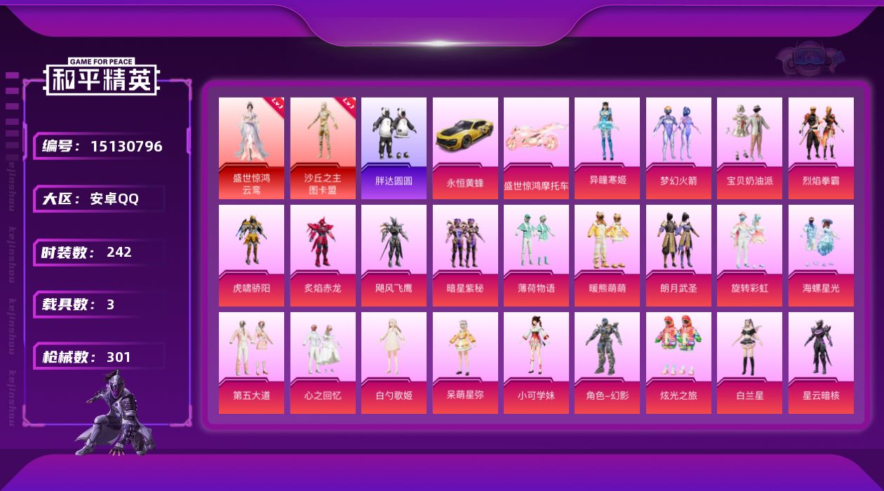 - [12916038]苹果 手Q-5粉装-4特效枪-1载具-1粉色飞行器-49673热力值-10王牌印记-109套装-166枪皮 【热门品类】:角色-军刀雅典娜,套装-龟仙人 【粉色载具】:玛莎拉蒂Quattroporte(夜幕蓝) 【粉色套装】:粉装-焦糖拿铁,角色-复仇流浪者,粉装-彩虹甜喵,角色-烟云彩露,粉装-幻彩电音 【粉色枪皮等级】:M416-电玩时刻(五级),GROZA-焦糖拿铁(七级),Kar98K-巳巳如意(五级),DP-28-豹影疾电(一级) 【粉色枪皮】:M416-电玩时刻,GROZA-焦糖拿铁,Kar98K-巳巳如意,DP-28-豹影疾电 【粉色飞行器】:镜光幻境飞行翼 【粉色降落伞】:梦幻火箭降落伞,焦糖拿铁降落伞,环太平洋降落伞,垂柳戏鸭降落伞,旋转彩虹降落伞,未来歌姬降落伞,炫光之旅降落伞,江南烟雨降落伞,精灵梦叶罗丽降落伞 【稀有套装】:套装-龟仙人,套装-糖糖葫芦,套装-青团波波,套装-棉花软糖,角色-摩登魅猫,套装-燕燕于飞,套装-鱼渊荷华,角色-糖霜甜心,套装-星影赞美诗 【稀有枪皮】:AKM-夜灯,AKM-彩虹符号,AKM-破晓战魂,AKM-龙的传人,M16A4-幻世战舞者,M16A4-甜心亚梦,M16A4-红色方程式,M16A4-蓝色火焰,SCAR-L-夜灯,SCAR-L-玉兔迎春,SCAR-L-红色方程式,M416-糯团青竹,M416-红色方程式,M416-蓝色火焰,GROZA-懵萌河马,GROZA-治愈之星,GROZA-田园牧歌,AUG-耀粉歌者,QBZ-未来歌姬,QBZ-赛罗,M762-天降萌叽,M762-彩虹符号,M762-第五大道,Mk47-妙红点点,Mk47-炫光之旅,G36C-懵萌河马,G36C-星穹咏叹调,AC-VAL-彩虹甜喵,AC-VAL-快闪甜心,AC-VAL-甜心亚梦,蜜獾-天降萌叽,蜜獾-娇憨猪猪,UZI-啾咪啾咪,UZI-天降萌叽,UZI-娇憨猪猪,UMP45-涂山之恋,UMP45-蓝色火焰,Vector-焰鹰斗篷,Vector-田园牧歌,汤姆逊-天降萌叽,汤姆逊-环太平洋,P90-倾城蜜语,P90-快闪甜心,Kar98K-彩虹符号,Kar98K-炫彩节奏,Kar98K-红色方程式,AWM-焰鹰斗篷,AWM-圣堂之誓,SKS-炫彩节奏,SKS-焦糖拿铁,VSS-彩虹符号,VSS-田园牧歌,Mini14-旋转彩虹,Mi