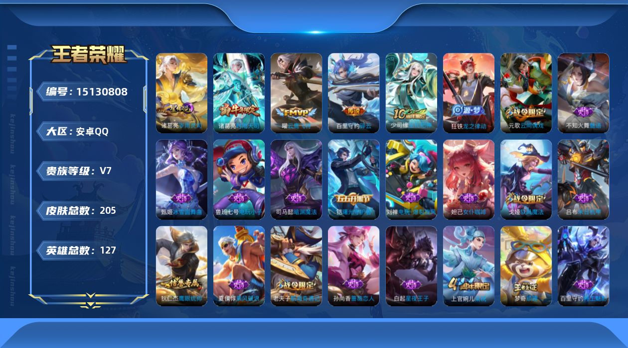 [15130808]【店主推荐捡漏号!可直接换绑】安卓Q-V7-最强王者段位-127英雄-205皮肤-4传说-45史诗