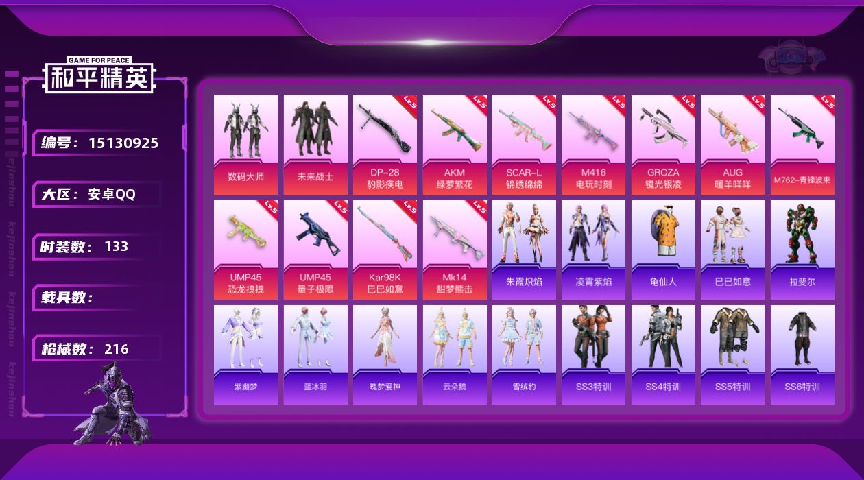 [15130925]【店主推荐捡漏号!可直接换绑】/地铁满天赋 安卓 手Q-2粉装-11特效枪-5.7w热力值-3王牌印记-133套装-216枪皮【热门品类】:套装-龟仙人【粉色套装】:粉装-数码大师,粉装-未来战士【粉色枪皮等级】:AKM-绿萝繁花(五级),SCAR-L-锦绣绵绵(五级),M416-电玩时刻(五级),GROZA-镜光银凌(五级),AUG-暖羊咩咩(五级),M762-青锋波束(五级),UMP45-恐龙拽拽(五级),UMP45-量子极限(五级),Kar98K-巳巳如意(五级),Mk14-甜梦熊击(五级),DP-28-豹影疾电(五级)