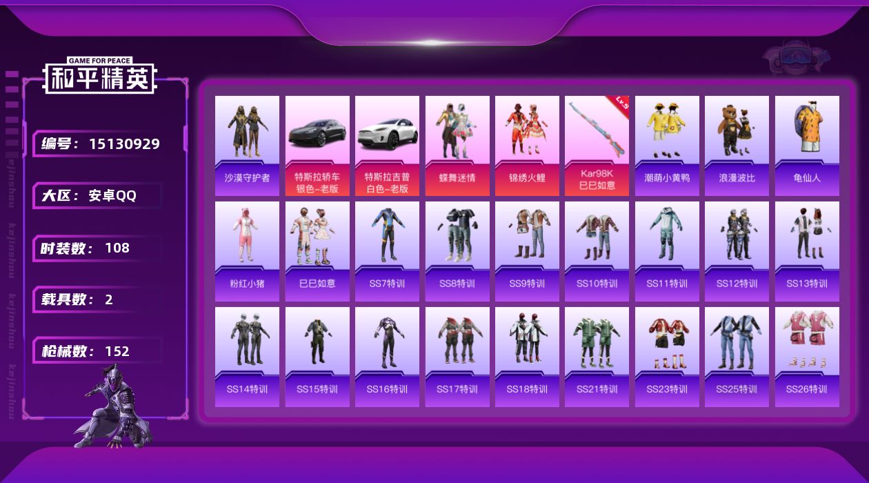 [15130929]【店主推荐捡漏号!可直接换绑】 安卓 手Q-2粉装-1特效枪-2载具-1粉色飞行器-5.1w热力值-1王牌印记-108套装-152枪皮【热门品类】:套装-沙漠守护者,套装-龟仙人,套装-潮萌小黄鸭,套装-浪漫波比,套装-粉红小猪【粉色载具】:特斯拉Model 3(冷光银),特斯拉Model X(珍珠白)【粉色套装】:粉装-蝶舞迷情,粉装-锦绣火鲤【粉色枪皮等级】:Kar98K-巳巳如意(五级)【粉色飞行器】:炫紫旋律飞行器