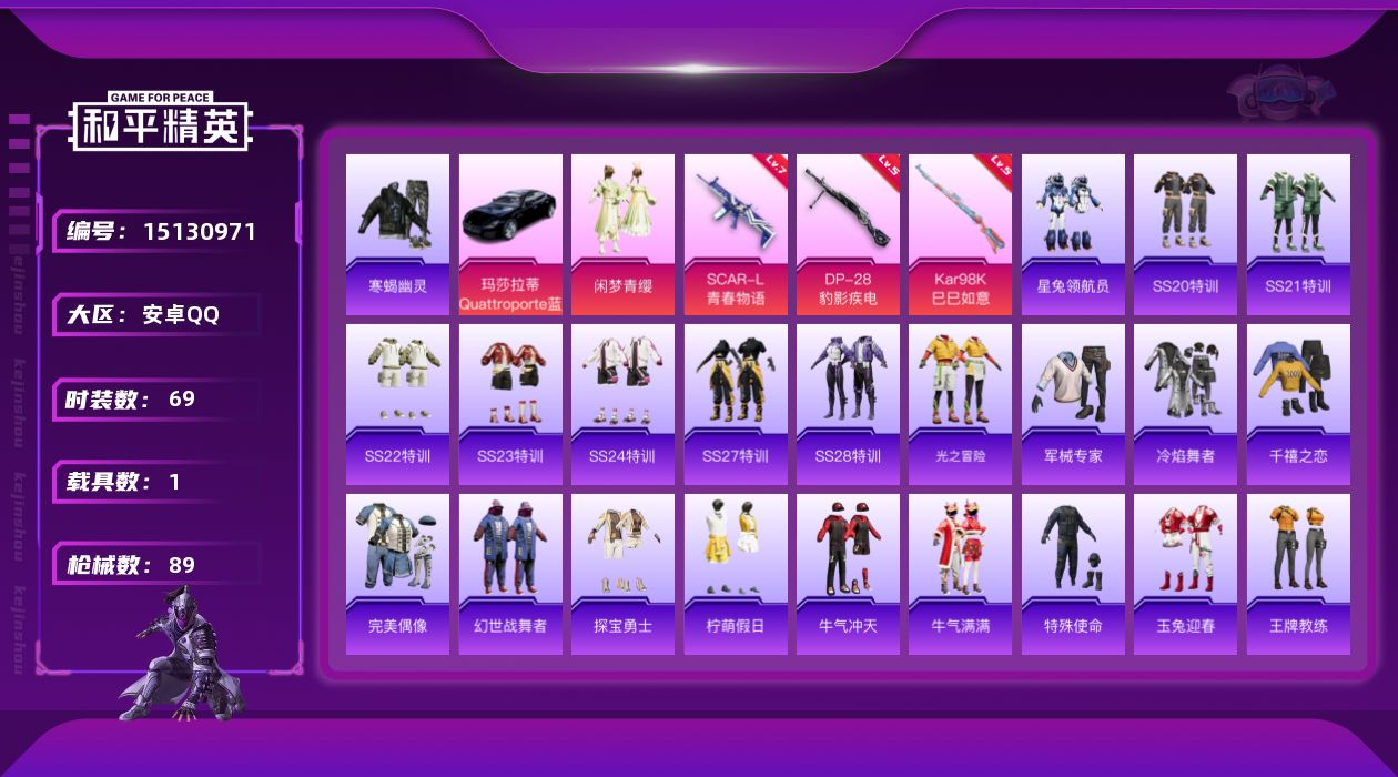 [15130971]可二次【店主推荐捡漏号!可直接换绑】 安卓 手Q-1粉装-3特效枪-1载具-2粉色飞行器-3w热力值-5王牌印记-69套装-89枪皮【热门品类】:套装-寒蝎幽灵【粉色载具】:玛莎拉蒂Quattroporte(夜幕蓝)【粉色套装】:粉装-闲梦青缨【粉色枪皮等级】:SCAR-L-青春物语(七级),Kar98K-巳巳如意(五级),DP-28-豹影疾电(五级)【粉色飞行器】:千面幻镜飞行器