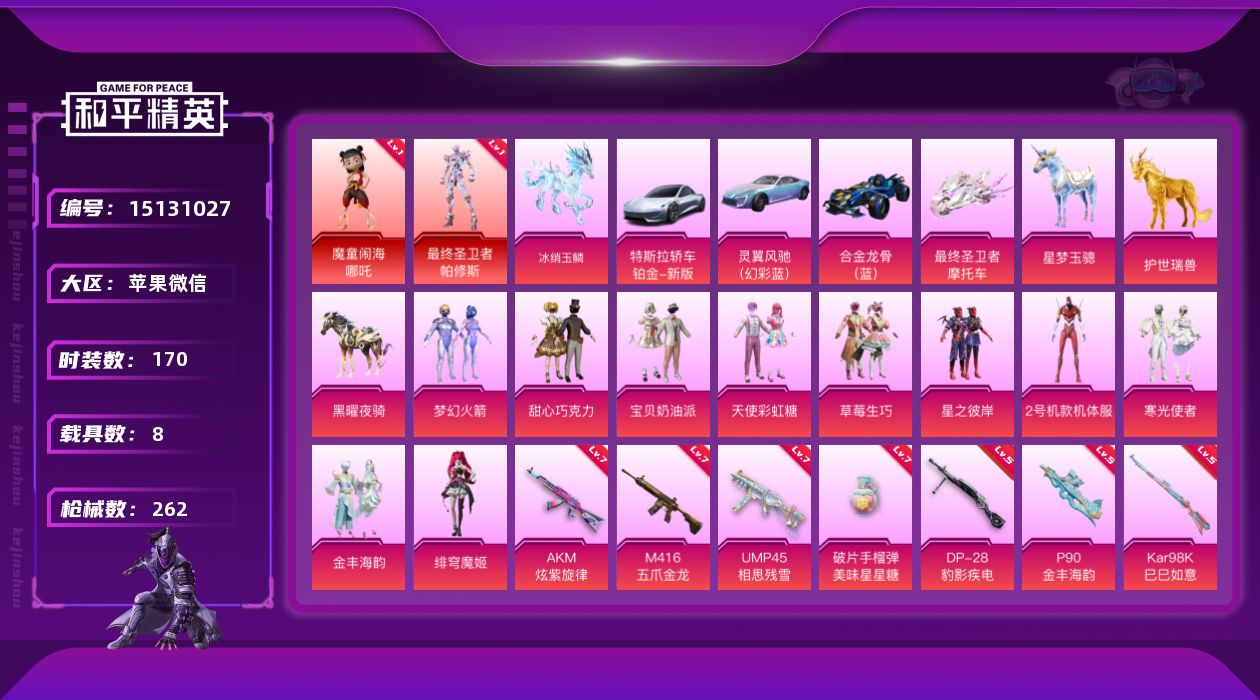 [15131027]素材身法号 苹果 微信-2神装-10粉装-12特效枪-8载具-8粉色飞行器-10.2w热力值-20王牌印记-170套装-262枪皮【红色神装等级】:魔童闹海-哪吒(一级),最终圣卫者-帕修斯(一级)【热门品类】:粉装-梦幻火箭,套装-暗影哥特,套装-浪漫波比,套装-粉红小猪,角色-Mark.06【粉色载具】:特斯拉Roadster(尊享铂),灵翼风驰(幻彩蓝),合金龙骨(蓝),最终圣卫者摩托车,星梦玉骢,护世瑞兽,黑曜夜骑,冰绡玉鳞【粉色套装】:粉装-甜心巧克力,粉装-宝贝奶油派,粉装-天使彩虹糖,粉装-梦幻火箭,粉装-草莓生巧,粉装-星之彼岸,角色-2号机款机体服,粉装-寒光使者,粉装-金丰海韵,角色-绯穹魔姬【粉色枪皮等级】:AKM-炫紫旋律(七级),SCAR-L-纯梦嫁纱(一级),SCAR-L-金蛇镇世(一级),SCAR-L-魔童闹海 哪吒(三级),M416-五爪金龙(七级),AUG-星梦奇缘(三级),UMP45-相思残雪(七级),Vector-最终圣卫者(三级),P90-金丰海韵(五级),Kar98K-巳巳如意(五级),DP-28-豹影疾电(五级),破片手榴弹-美味星星糖(七级)【粉色飞行器】:夏日绵绵冰飞行器,相思残雪飞行器,万象金身飞行器,终晖之翼飞行器,灵猫魔法师飞行器,飞天猪飞行器,灵珠游龙飞行器